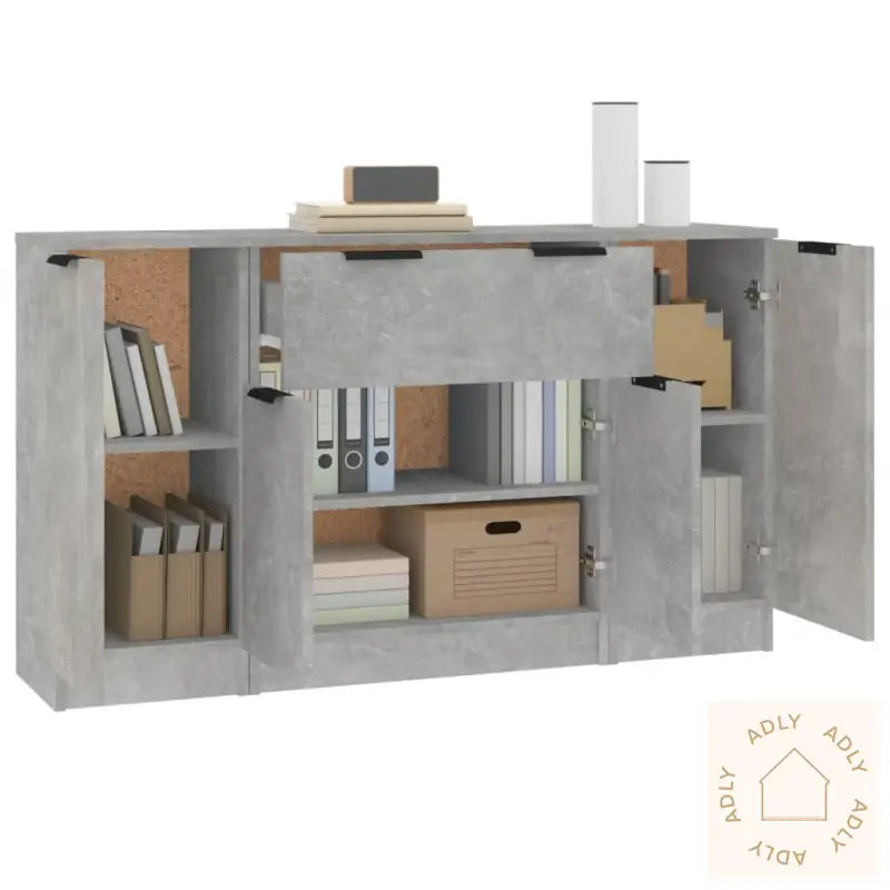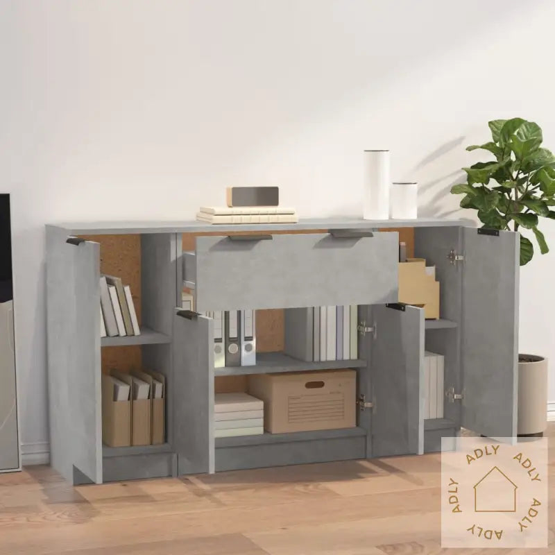 Husk å montere medfølgende festemidler mot veggen for å forhindre at produktet velter, spesielt om du har små barn eller kjæledyr hjemme.Farge: betonggråMateriale: konstruert treMål (skjenk med dør): 30 x 30 x 70 cm (B x D x H)Mål (skjenk med skuff): 60 x 30 x 70 cm (B x D x H)Leveransen inneholder:2 x skjenker (med dør)1 x skjenk (med skuff)Legal Documents: