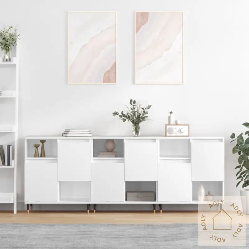 For å forhindre at møbelet velter bør det alltid festes til veggen med den medfølgende festeanordningen.Farge: hvitMaterialer: konstruert tre, metallSamlet mål: 180 x 35 x 70 cm (B x D x H)Montering kreves: jaLeveransen inneholder:3 x skjenkerLegal Documents: