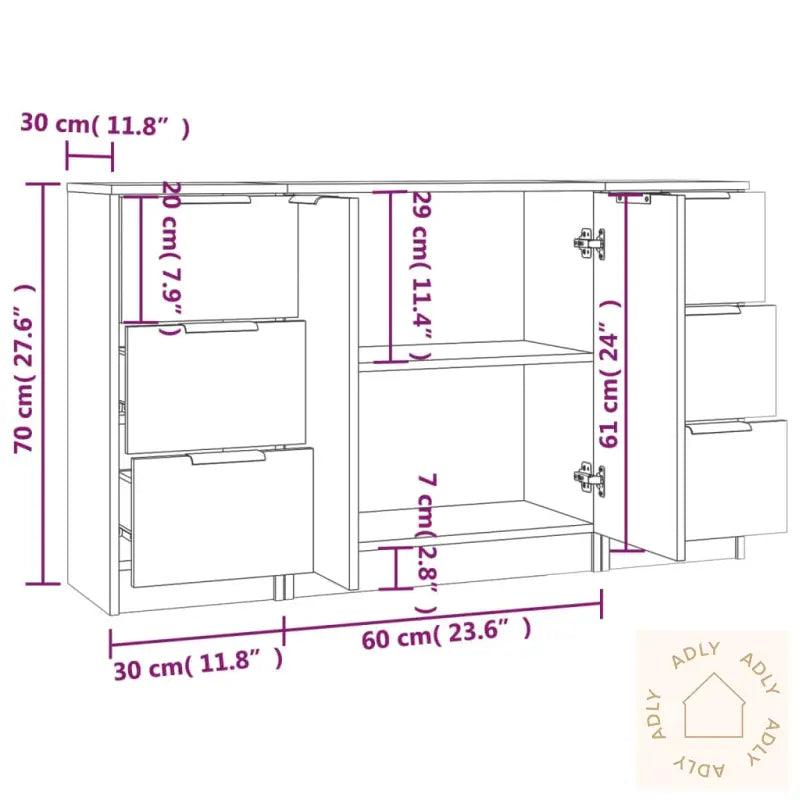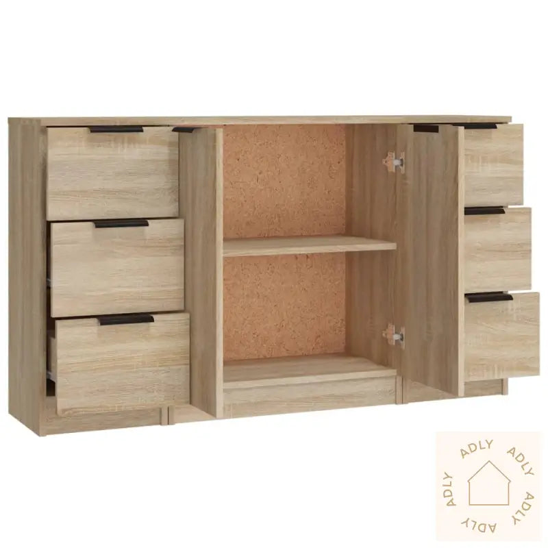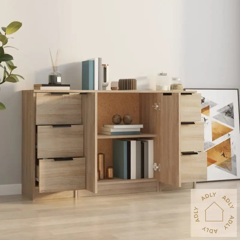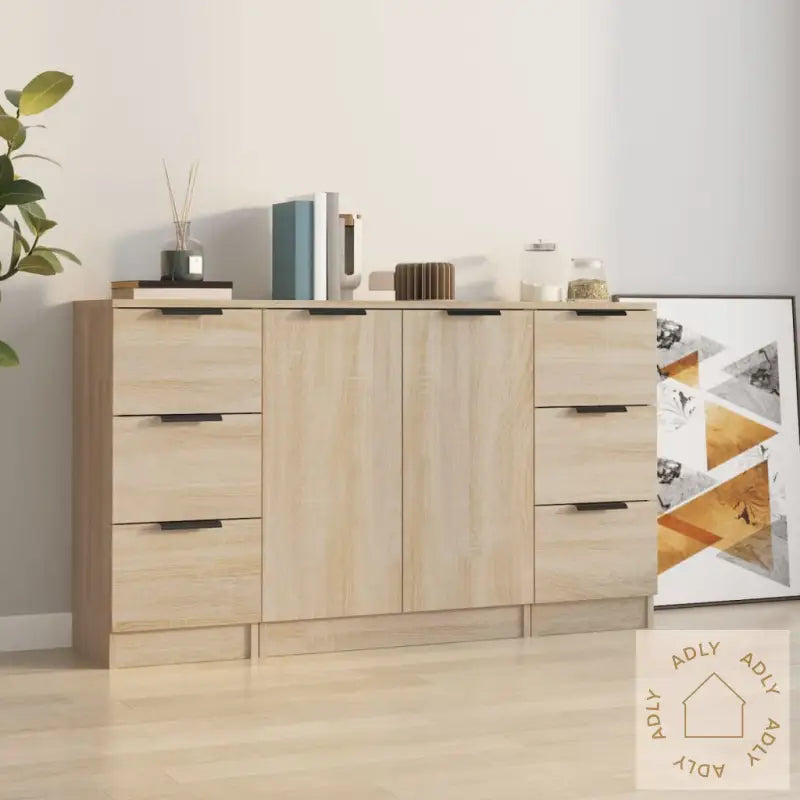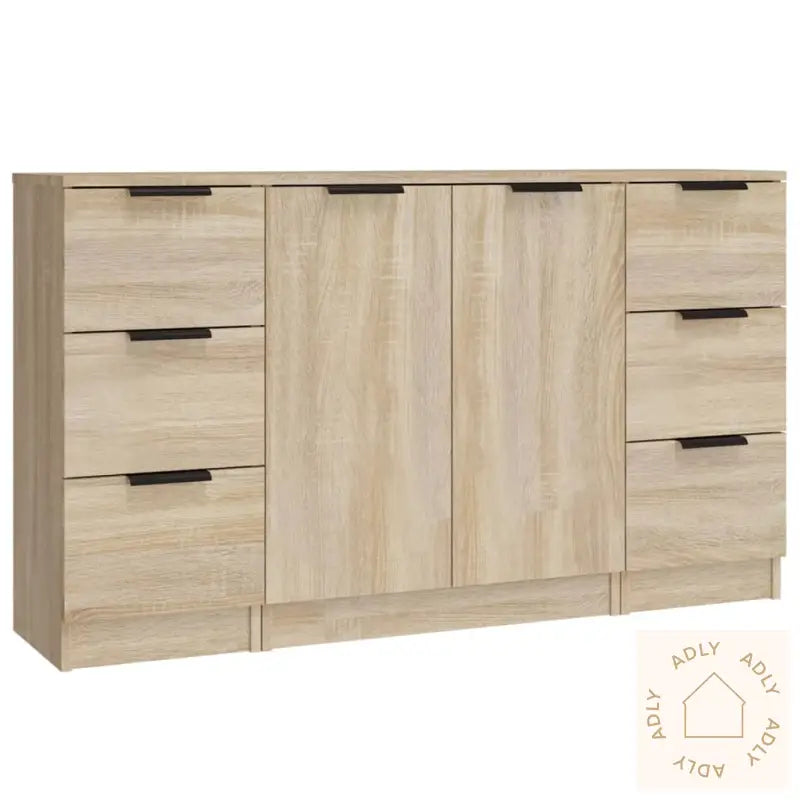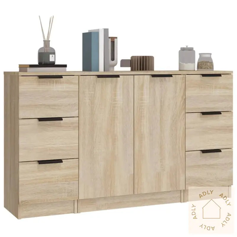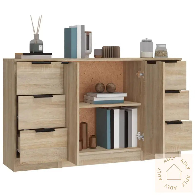 For ekstra sikkerhet: bruk de medfølgende festemidlene for å sikre skjenken til veggen og forhindre at den velter.Farge: Sonoma eik – et lunt treverk som gir et naturlig og tidløst uttrykk, perfekt for deg som ønsker myke og moderne detaljer blant dine eksisterende møbler til hjemmet.Materiale: Konstruert treMål (skjenk med 3 skuffer): 30 x 30 x 70 cm (B x D x H)Mål (skjenk med 2 dører): 60 x 30 x 70 cm (B x D x H)Leveransen inneholder:2 x skjenker med 3 skuffer1 x skjenk med 2 dører
