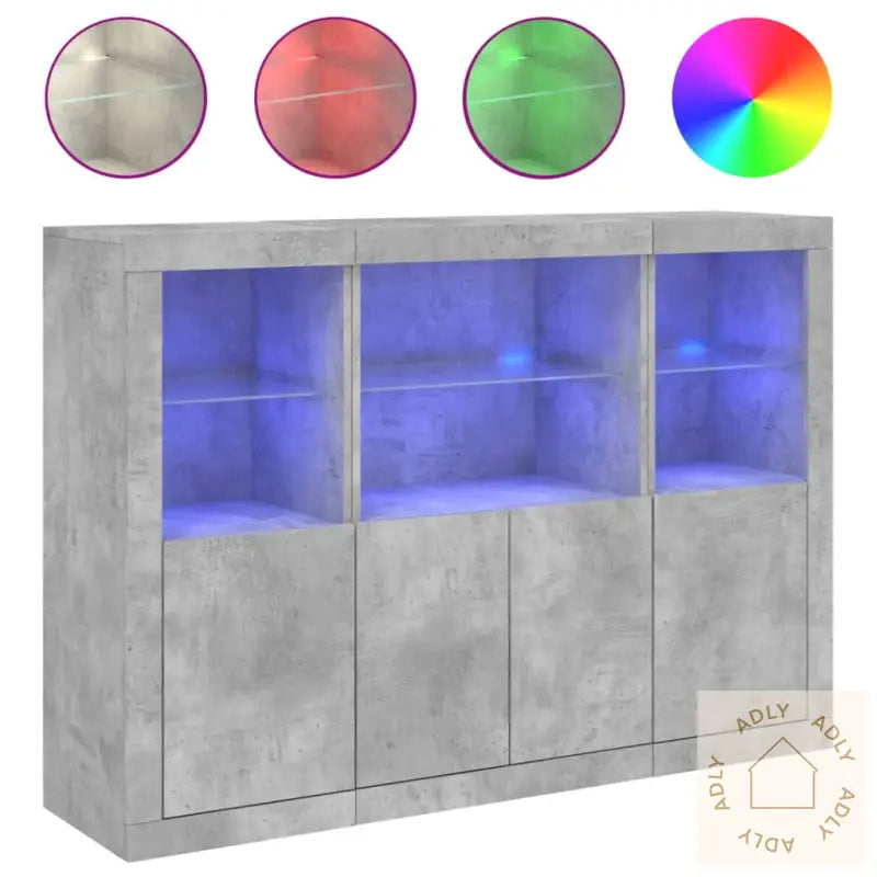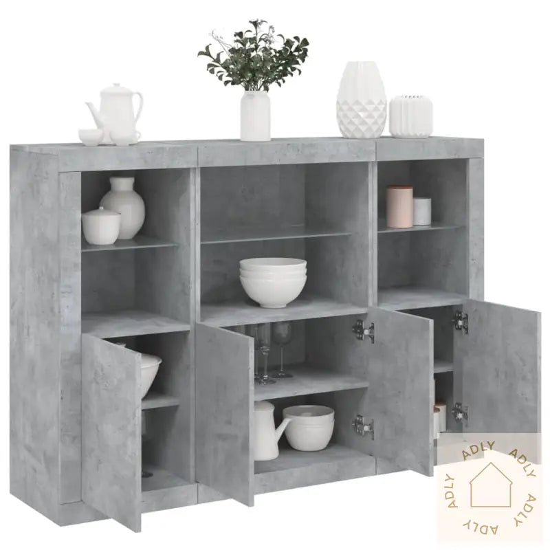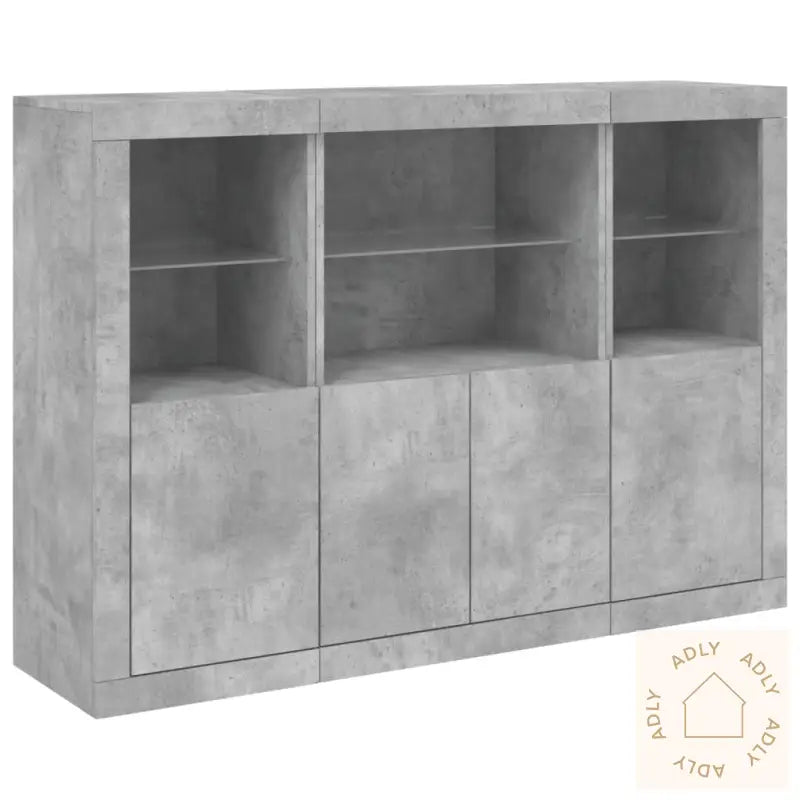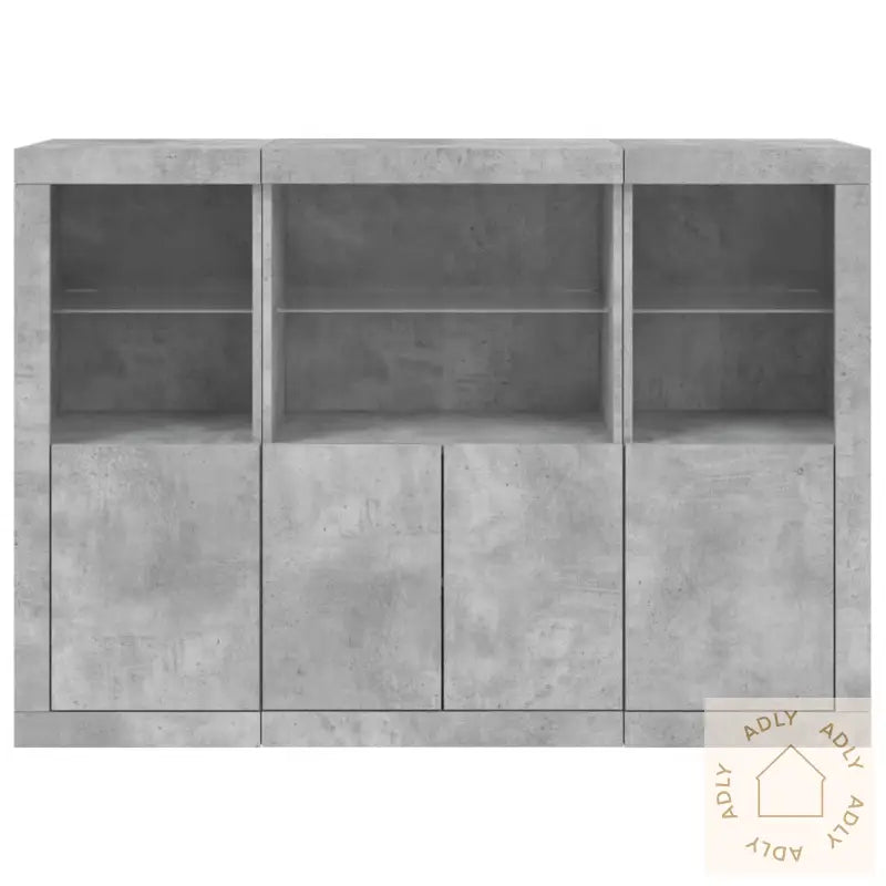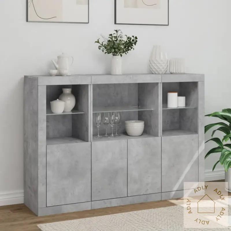 Produktet leveres med USB-kontakt, så du trenger en sertifisert 5V USB-strømkilde for LED-lysene (ikke inkludert).Farge: betonggråMaterialer: konstruert tre, glassSamlet mål: 142,5 x 37 x 100 cm (B x D x H)Montering: må settes sammenPakken inneholder:2 x skjenker: 41 x 37 x 100 cm (B x D x H)1 x skjenk: 60,5 x 37 x 100 cm (B x D x H)Legal Documents: