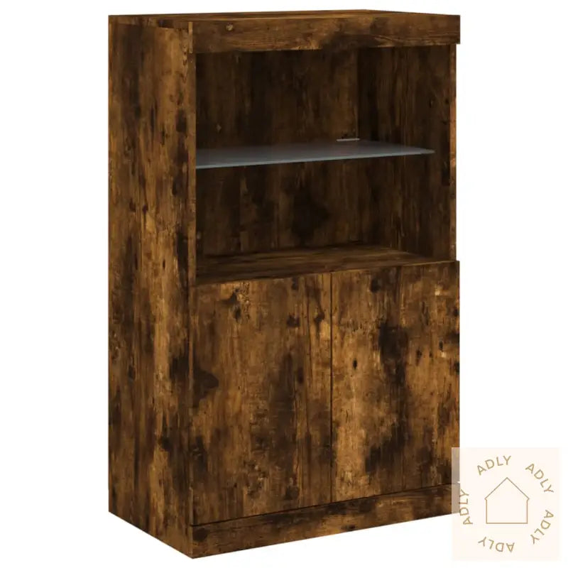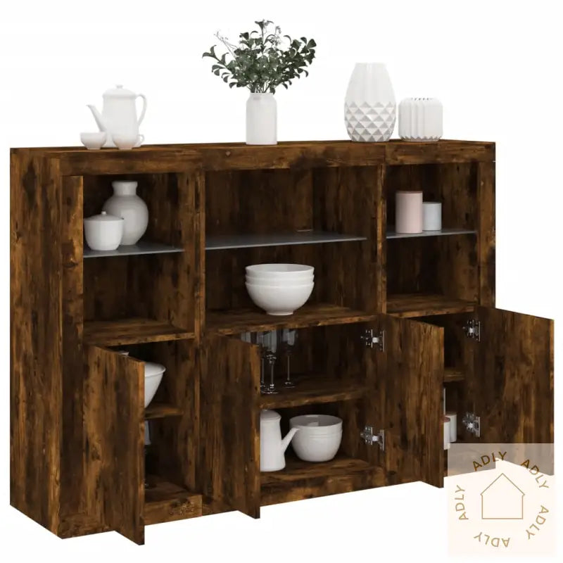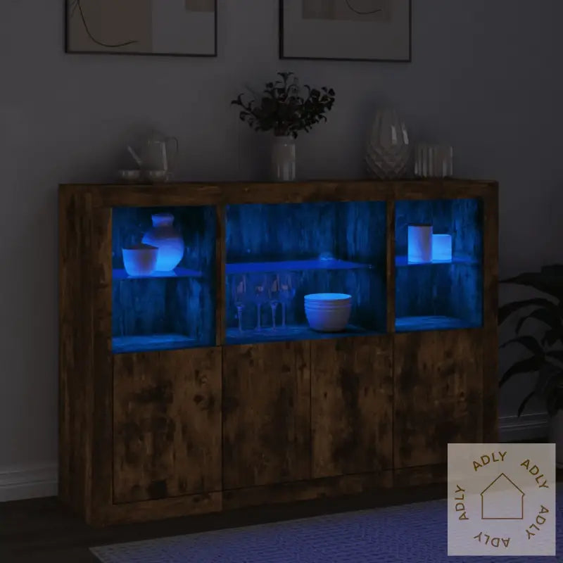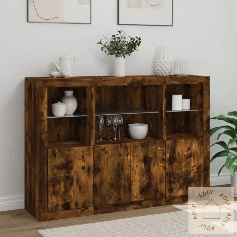 Skapene er laget av slitesterkt konstruert treverk av høy kvalitet, noe som gir en glatt overflate og sikrer varig styrke, god stabilitet og motstandsdyktighet mot fuktighet. Dette gjør skjenkene både praktiske og holdbare – perfekte som møbler i ethvert hjemmemiljø.Med rikelig lagringsplass får du rom for alt fra bøker og bokhyller, til fjernkontroller, magasiner og småting du vil ha lett tilgjengelig men ryddig oppbevart. Perfekt også for deg som elsker orden blant møbler og stående hyller.Den robuste toppen er ideell for å vise frem små dekorative elementer, favorittbilder i fotorammer eller en fresh potteplante – skap din personlige stil på en enkel måte.RGB LED-lysene har ulike menyer slik at du kan endre lysfargen og automatisk justere stemningen etter behov. Skap et unikt og fargerikt uttrykk i hjemmet – en funksjon mange setter pris på når de velger nye møbler eller hagemøbler med det lille ekstra.Advarsel: