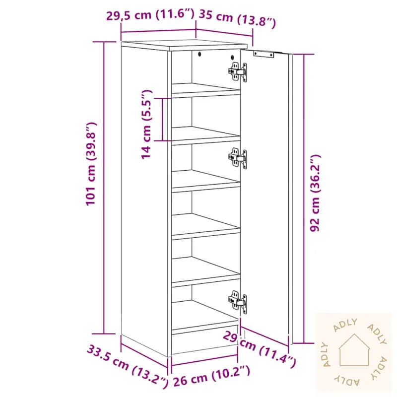 Stabilt og slitesterkt materiale: Skoskapet er laget av konstruert tre – et robust og holdbart materiale som holder formen over tid. Dette materialet er kjent for sin jevne overflate og gode motstandsdyktighet mot fukt, vridning og sprekker, så du får et skoskap du kan stole på i mange år fremover.Rikelig oppbevaringsplass: Hyllene gjør det enkelt å sortere og oppbevare flere par sko. Med den smarte utformingen får du orden på skoene, og unngår at de ligger slengt rundt på gulvet. Perfekt for deg som liker å ha ting ryddig!Med dør: Skapet leveres med en praktisk dør, slik at skoene dine ikke bare holdes usynlige, men også beskyttes mot støv. Dette gir et renere inntrykk og beskytter skoene dine lengre.Praktisk topphylle: Den solide toppen på skoskapet gir deg ekstra plass til å vise frem dekor, bilder eller oppbevare nøkler og lommebok, slik at du alltid har dem lett tilgjengelig når du skal ut døren.Enkelt vedlikehold: Overflaten er glatt, noe som gjør rengjøring superenkelt – bare tørk av med en fuktig klut. Dette betyr mindre jobb for deg og et alltid fresht møbel.Advarsel: