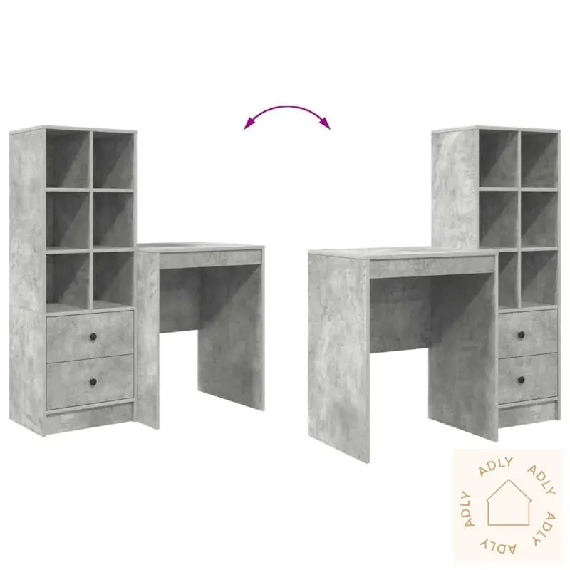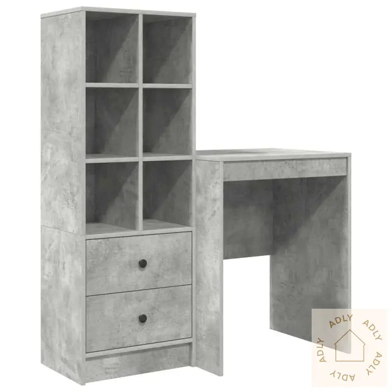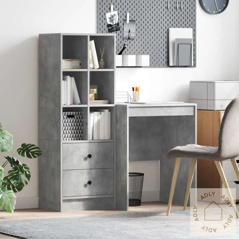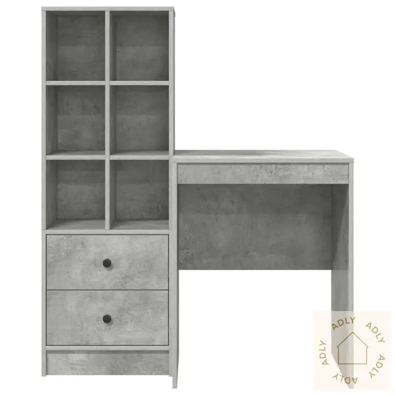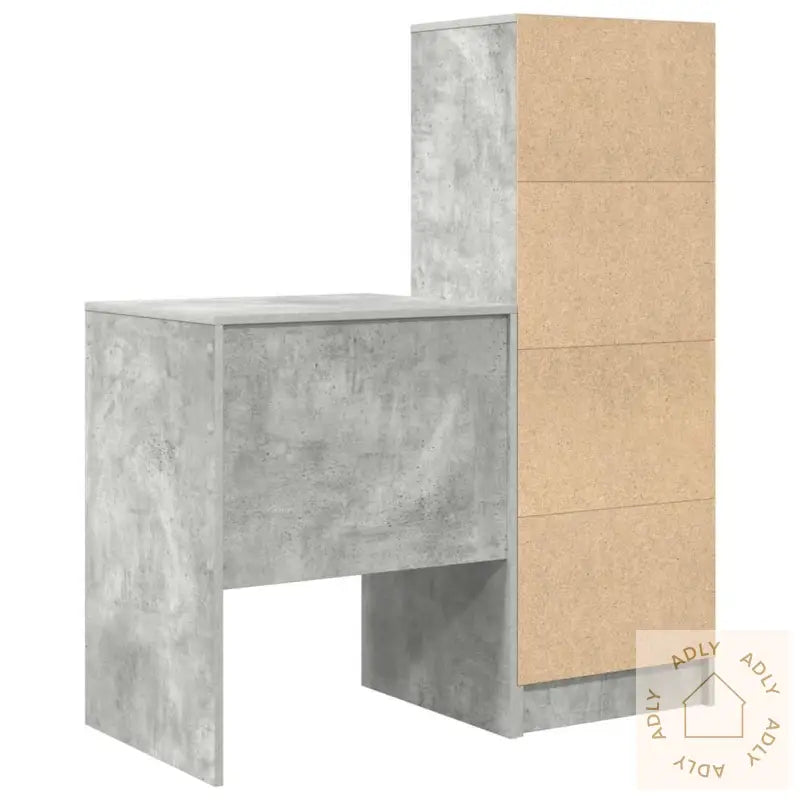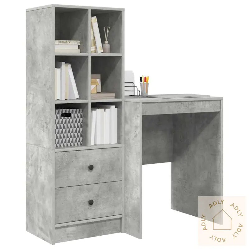 Dette vidaXL skrivebordet med praktisk lagringsplass gir et moderne og stilig løft til ethvert arbeidsrom eller hjemmekontor. Produsert i høykvalitets konstruert treverk med en matt betonggrå overflate, får du et skrivebord som kombinerer slitesterk funksjon med dagens trend innen møbler til hjemmet. Arbeidsflaten er glatt og gir deg en fleksibel plass for studier, skriving eller datamaskinarbeid, perfekt tilpasset både behovene dine og moderne interiør.