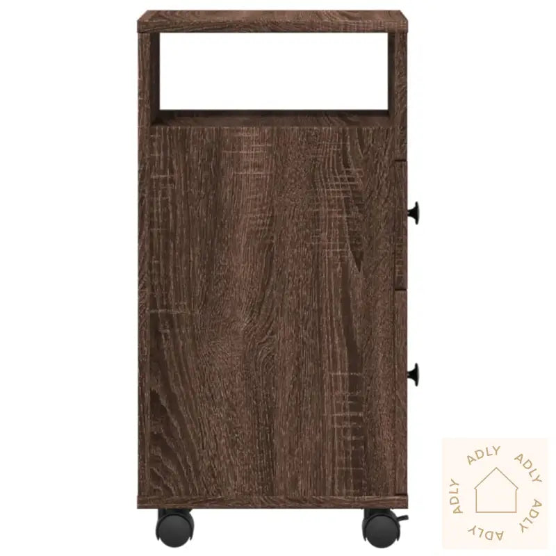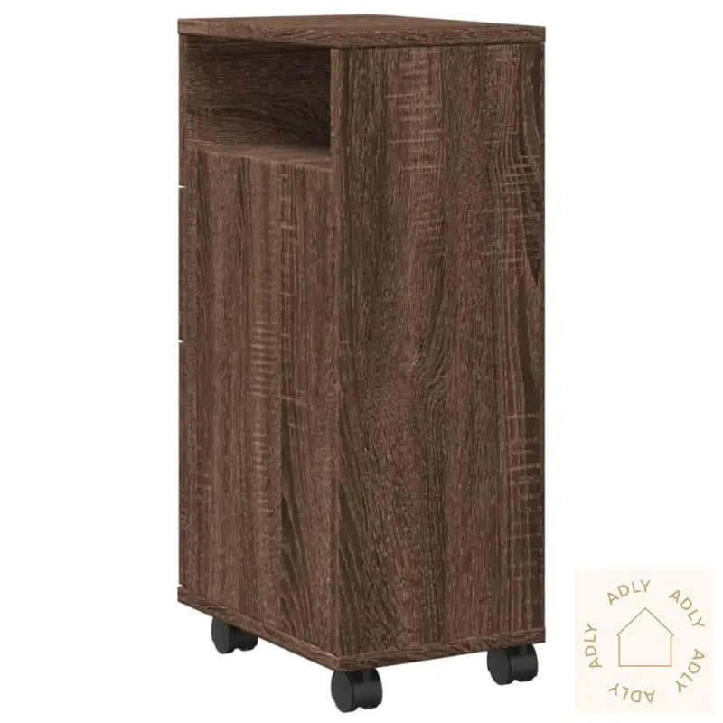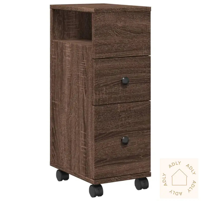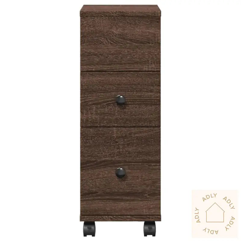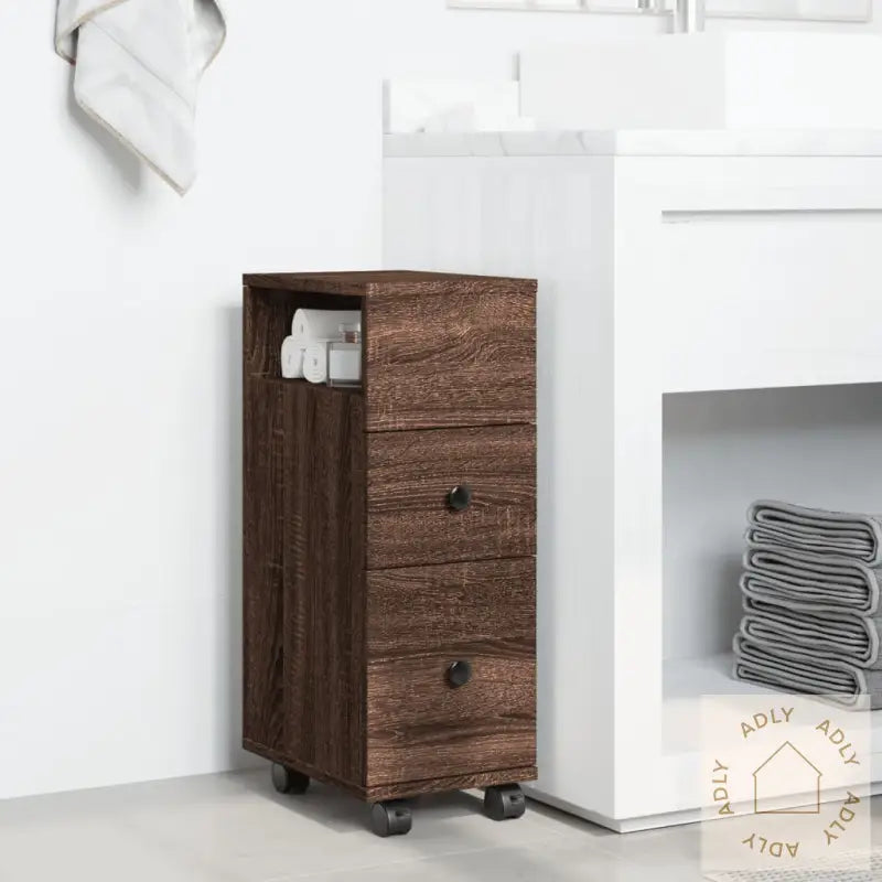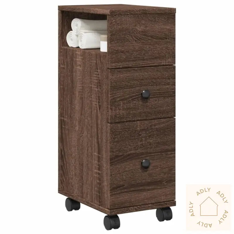 Stabilt og slitesterkt materiale: Laget av konstruert tre, noe som gjør det robuste skapet motstandsdyktig mot fuktighet, vridning og sprekker. Overflaten er jevn og enkel å rengjøre, perfekt for bruk i våtrom eller steder med mye aktivitet.Rikelig med oppbevaringsplass: Selv om skapet er slankt og tar minimalt med plass, får du overraskende mye lagringsplass. Alle skuffene og rommene hjelper deg å holde toalettsaker, små håndklær og andre baderomsartikler organisert og lett tilgjengelig, samtidig som de beskyttes mot støv og smuss.Enkel å flytte: Det smale baderomsskapet står på fire svingbare hjul, slik at du enkelt kan trille det dit du trenger ekstra oppbevaring – enten du pusser opp eller flytter rundt på møblene. To av hjulene har låsefunksjon som holder skapet stabilt når det står på plass.Enkelt å bruke: De solide metalskinnene sørger for at skuffer og oppbevaringsrom glir lett og lydløst, så det er alltid lett å få tilgang til tingene dine. Perfekt for hektiske morgener eller når du bare vil ha rask orden på badet.Allsidig: Det slanke baderomsskapet i brun eik passer like godt på badet som på kjøkkenet eller i stuen. Bruk det som ekstra oppbevaringsskap, kommode eller som smart møbel for å samle småting, tilpasset dine behov. Fargen brun eik gir et varmt og tidløst uttrykk som passer naturlig sammen med både moderne hagemøbler og annen innredning.Farge: brun eikMateriale: konstruert treSamlet mål: 23 x 33 x 65 cm (B x D x H)Mål skuff: 14 x 23,5 x 9 cm (B x D x H)Mål øverste skuffeboks: 23 x 30 x 11,5 (B x D x H)Antall skuffer: 2Antall hjul: 4 (2 med bremser)Lastekapasitet per hylle: 15-20 kgTotal lastekapasitet: 60 kgMontering kreves: ja