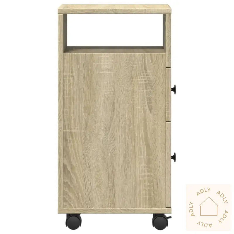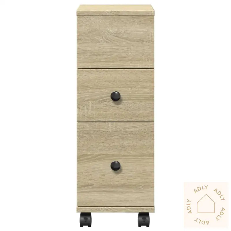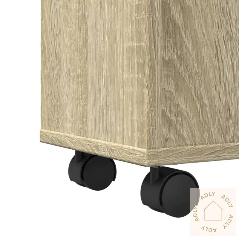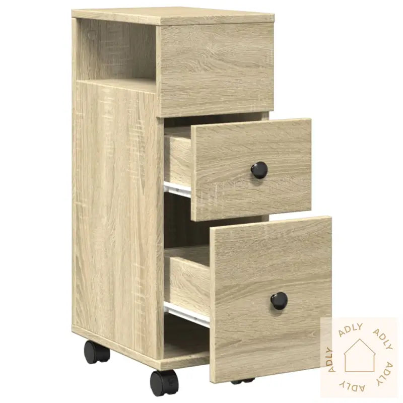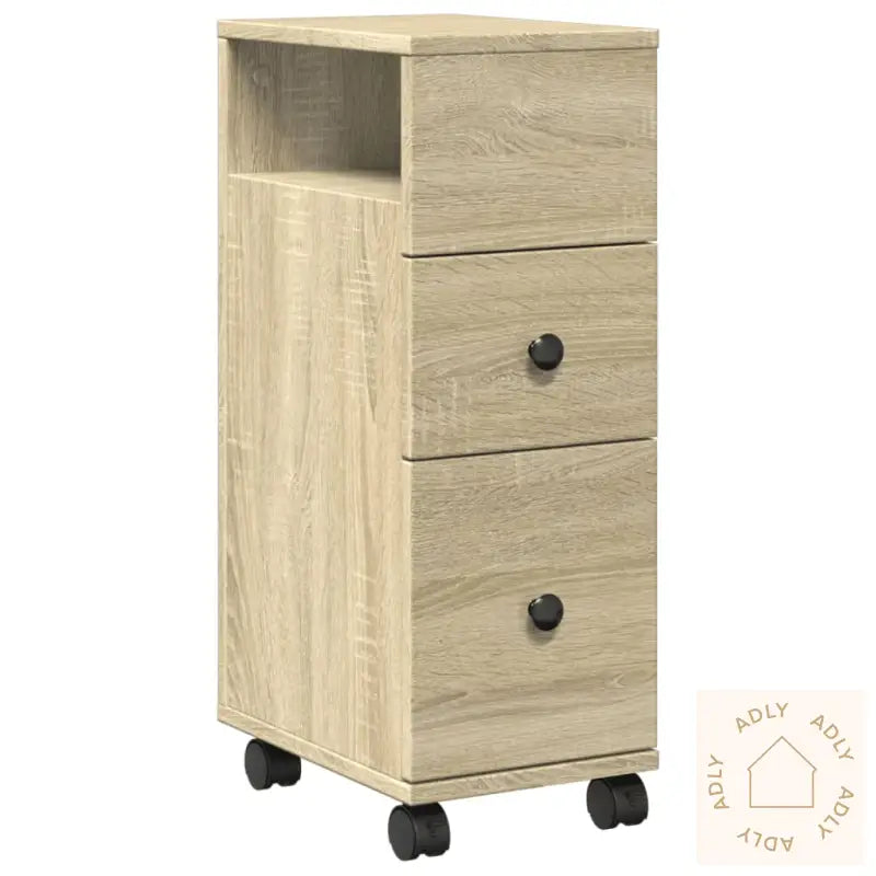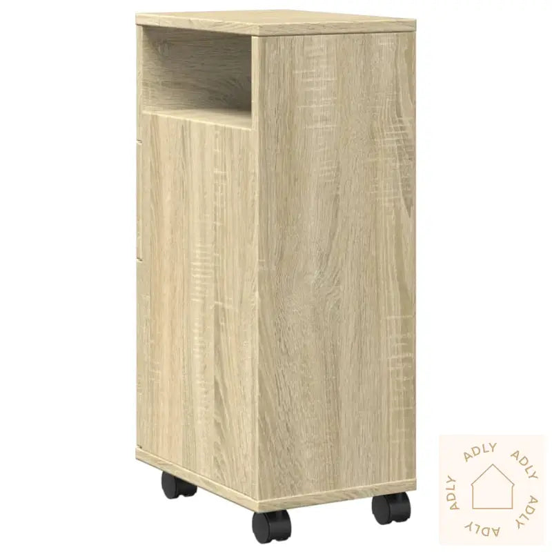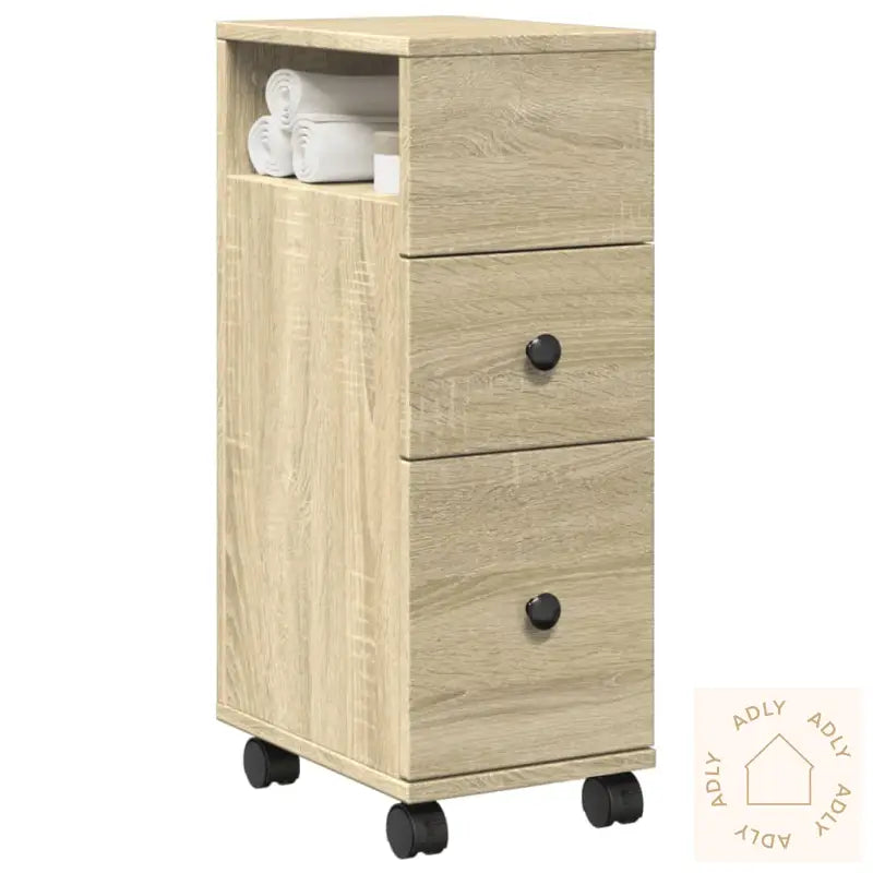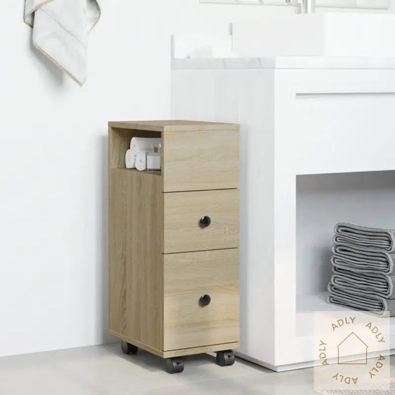 Stabilt og slitesterkt materiale: Konstruert tre gir slanke baderomsskapet en solid konstruksjon og lang levetid. Dette materialet motstår vridning, sprekker og fukt, noe som gjør at skapet fungerer godt i fuktige miljøer som badet.Rikelig med oppbevaring: Til tross for den smale størrelsen gir skapet deg god plass til å organisere kosmetikk, rengjøringsartikler og andre nødvendigheter, slik at du enkelt holder orden og hindrer støv og skitt.Praktisk mobilitet: Skapet har fire svingbare hjul, så det kan flyttes uten anstrengelse hvis du vil ommøblere eller gjøre rent. To av hjulene har låsemekanisme, som sikrer at skapet står stabilt når det er på plass.Lett tilgjengelig: Skuffene glir lett på metallskinner, så du får rask tilgang til alt du har lagret, selv på travle dager.Bred bruk: Den slanke utformingen gjør at dette skapet også passer til smale hjørner på kjøkkenet, vaskerommet eller stuen. Bruk det som ekstra oppbevaring der du trenger det mest.Farge: Sonoma eikMateriale: Konstruert treSamlet mål: 23 x 33 x 65 cm (B x D x H)Mål skuff: 14 x 23,5 x 9 cm (B x D x H)Mål øverste skuffeboks: 23 x 30 x 11,5 cm (B x D x H)Antall skuffer: 2Antall hjul: 4 stk (hvorav 2 med bremser)Lastekapasitet per hylle: 15-20 kgTotal lastekapasitet: 60 kgMontering kreves: ja