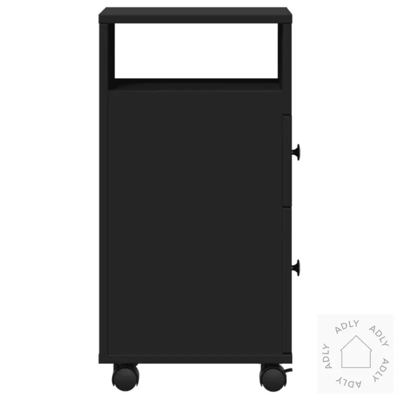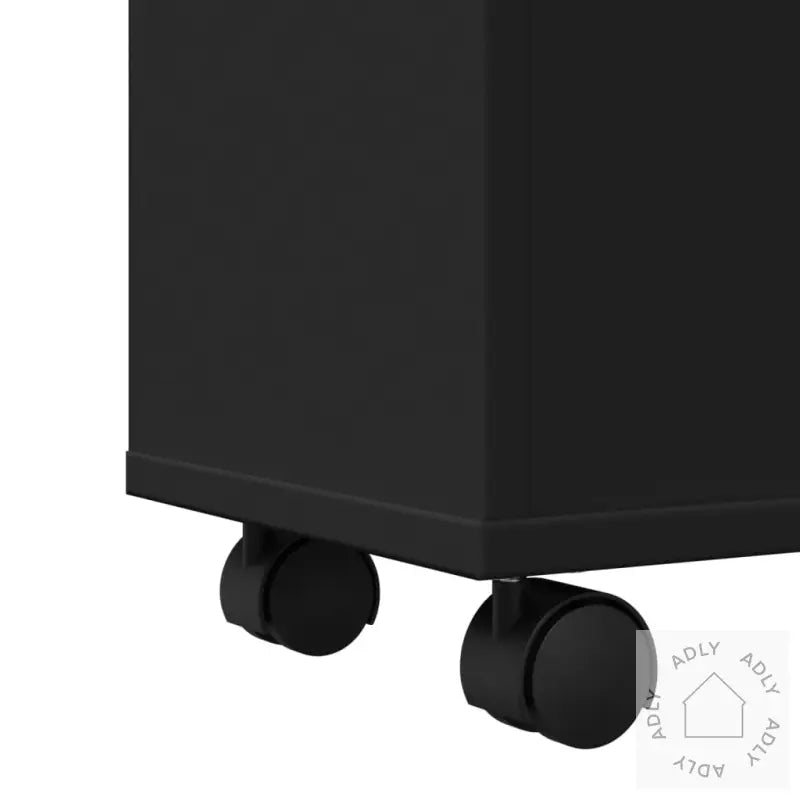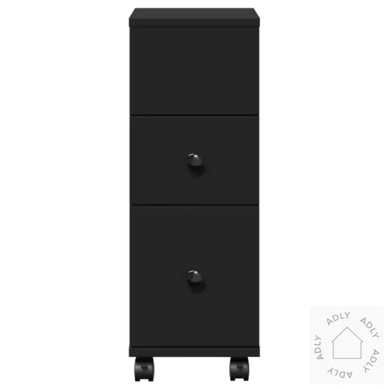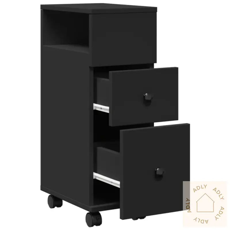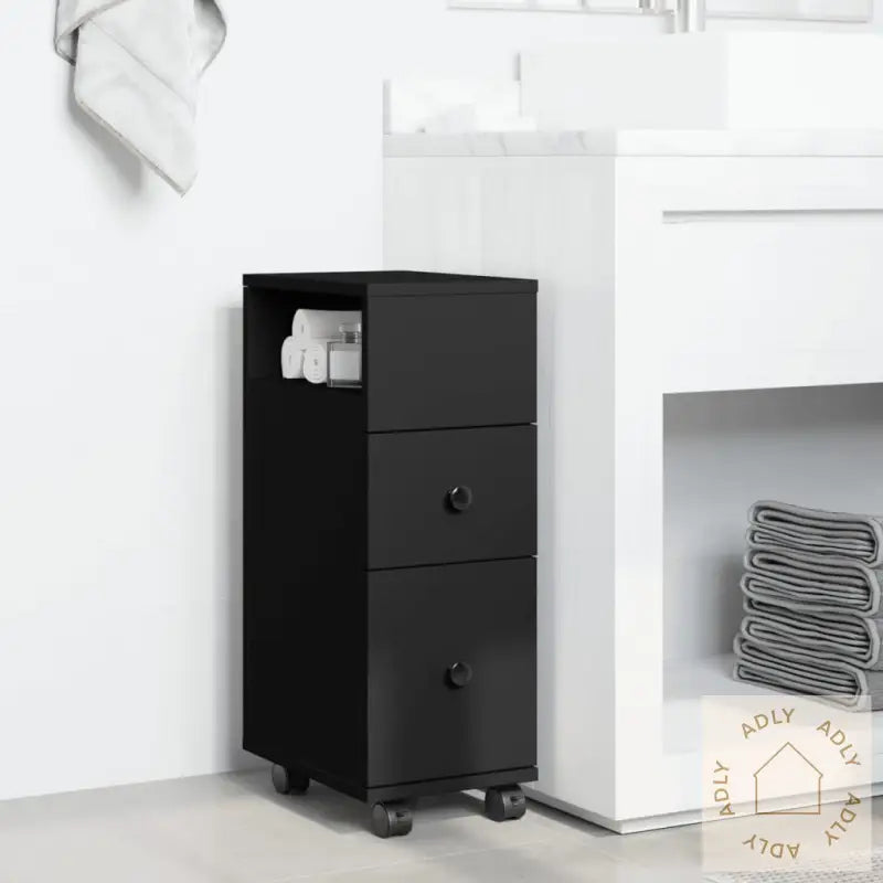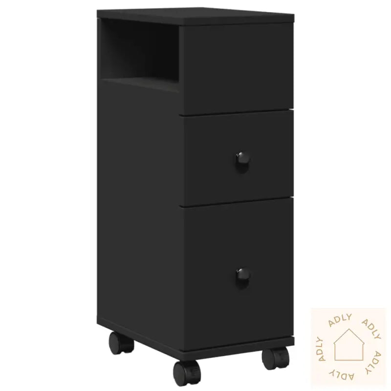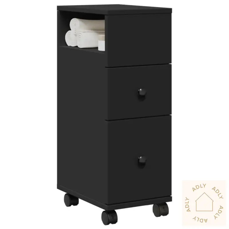Stabilt og slitesterkt materiale: Slanke baderomsskapet er laget av konstruert tre, som er kjent for sin robusthet og kvalitet. Dette materialet har en jevn overflate som tåler fuktighet uten at det vrir seg eller sprekker, noe som gjør det ideelt for bruk i både bad og andre rom. Du får dermed et møbel som holder seg pent lenge.Rikelig med oppbevaringsplass: Til tross for den smale utformingen gir skapet god oppbevaring, så du kan organisere hygieneprodukter, rengjøringsmidler eller andre småting effektivt. Dette beskytter tingene dine mot støv og holder baderommet ryddig og oversiktlig.Enkelt å flytte: Med fire svingbare hjul er det slanke baderomsskapet lett å flytte rundt etter behov, enten du vil endre plassering på badet, kjøkkenet eller i stuen. De to låsbare hjulene sørger for at skapet står stødig når det er på plass.Enkel tilgang: Skuffene glir lett på kvalitets-skinner i metall, slik at du alltid har enkel tilgang til innholdet uten å måtte bruke kraft – veldig praktisk, spesielt dersom skapet benyttes ofte.Allsidig bruk: Dette tynne baderomsskapet passer ikke bare på badet, men kan også brukes som en smart kommode eller oppbevaringsløsning på kjøkkenet eller i andre rom hvor du trenger ekstra oppbevaring. Det gir deg fleksibilitet til å bruke møbelet akkurat der det trengs mest.Farge: svartMateriale: konstruert treSamlet mål: 23 x 33 x 65 cm (B x D x H)Mål skuff: 14 x 23,5 x 9 cm (B x D x H)Mål øverste skuffeboks: 23 x 30 x 11,5 (B x D x H)Antall skuffer: 2Antall hjul: 4 (2 med bremser)Lastekapasitet per hylle: 15-20 kgTotal lastekapasitet: 60 kgMontering kreves: ja