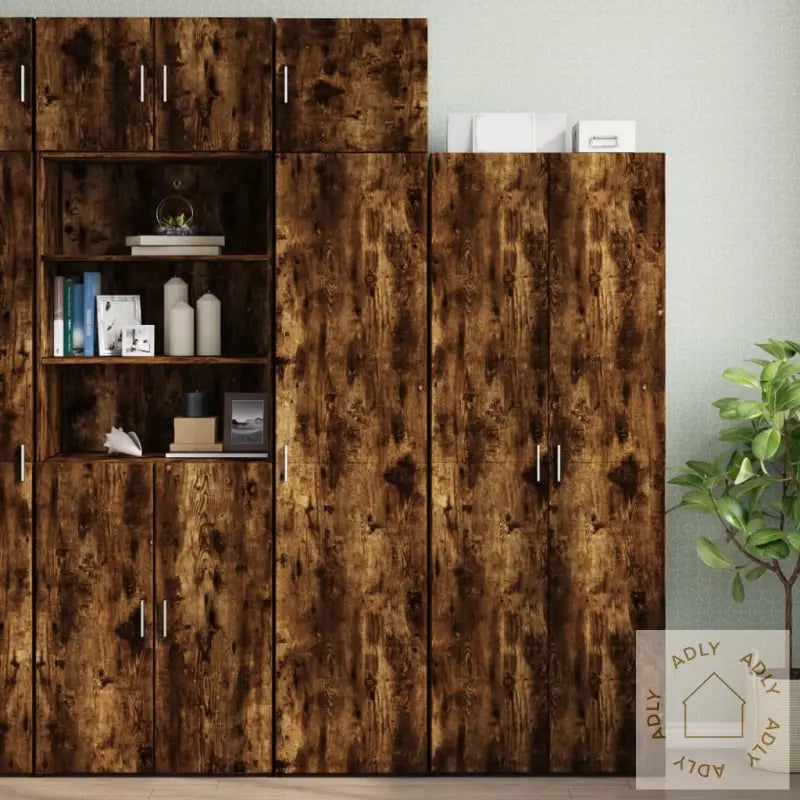 Skruer og plugger til veggmontering følger ikke med, så husk å kjøpe passende skruer og plugger ut fra veggtypen hjemme hos deg. Er du usikker, anbefaler vi å spørre en fagperson. Les nøye gjennom monteringsanvisningen og følg trinnene for riktig montering.Farge: Røkt eikMateriale: Konstruert treMål totalt: 45 x 42,5 x 225 cm (B x D x H)Mål lite skap: 45 x 42,5 x 40 cm (B x D x H)Mål stort skap: 45 x 42,5 x 185 cm (B x D x H)Antall rom: 8Montering kreves: Ja