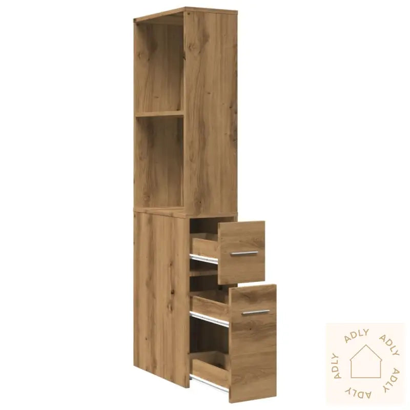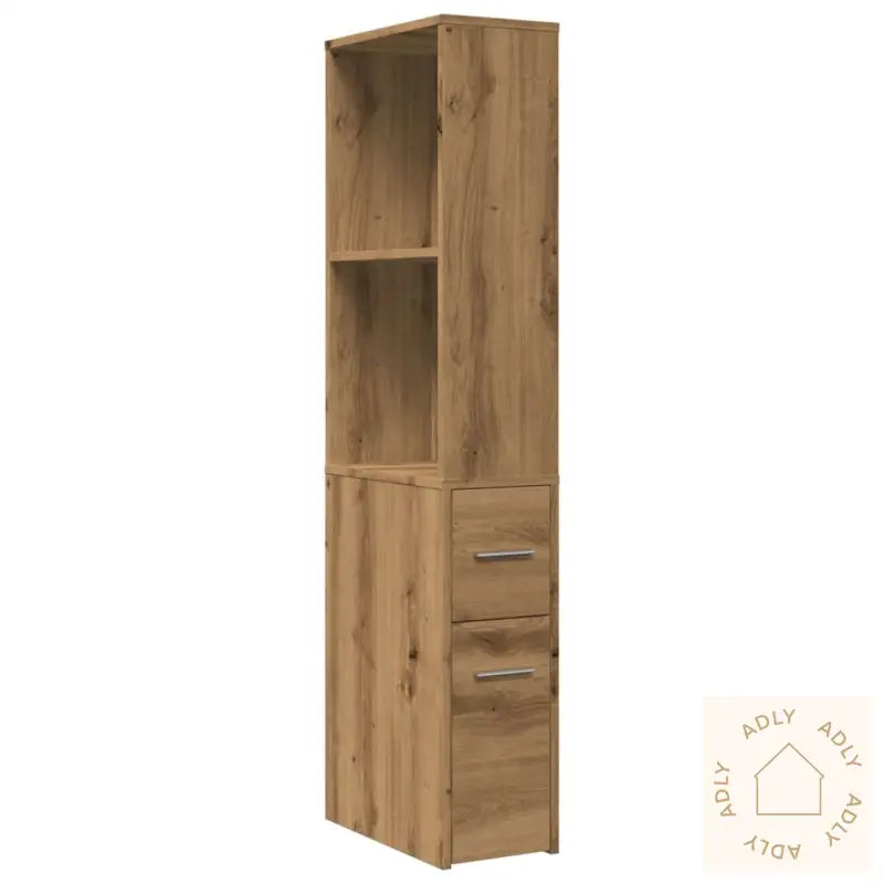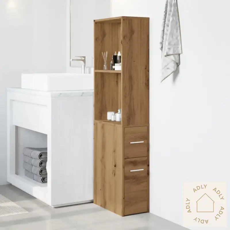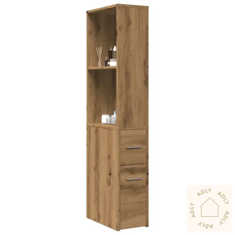Dette klassiske, smale baderomsskapet er et både dekorativt og praktisk tillegg i hjemmet, perfekt for deg som ønsker et funksjonelt oppbevaringsmøbel uten å ofre stilen. Designet i vakker artisan eik gir skapet et stilrent preg og gjør det enkelt å matche med annet interiør eller møbler til hjemmet.
