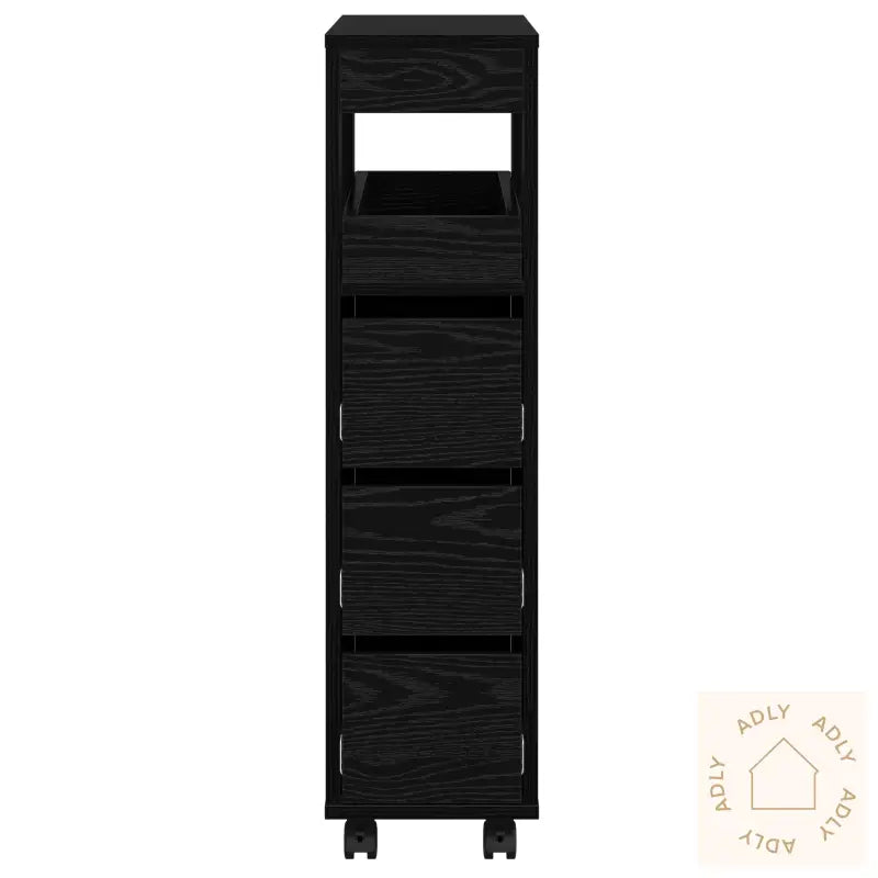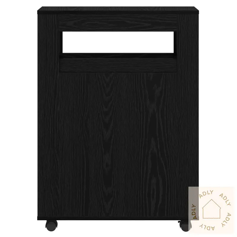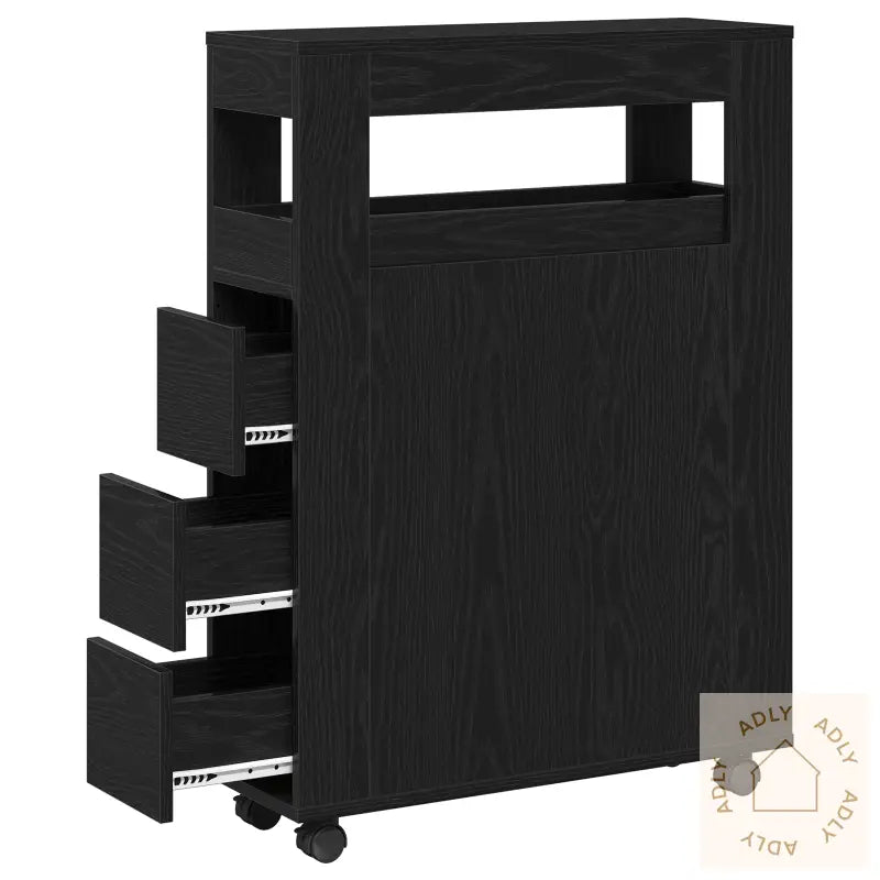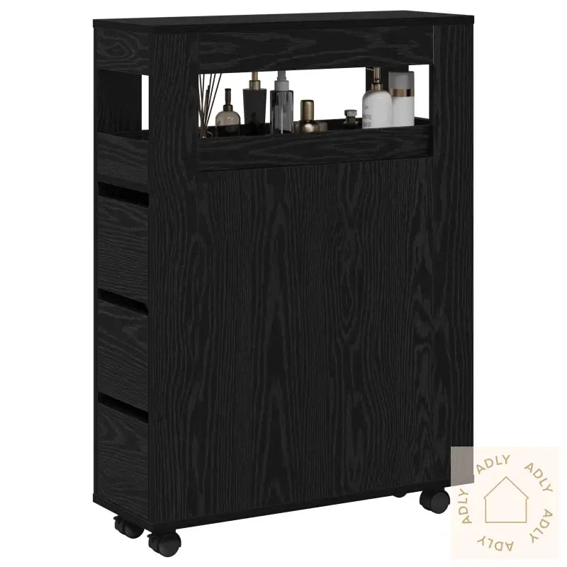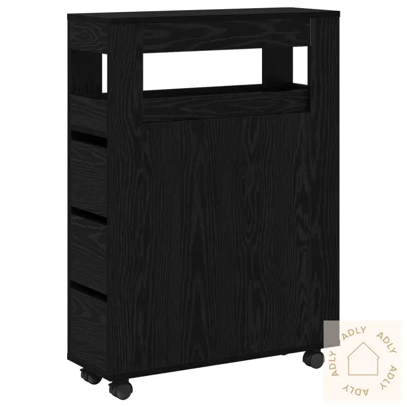 Bedre mobilitet: Skapet har fire hjul slik at du enkelt kan flytte det rundt etter behov. Det gjør det fleksibelt og smart for deg som ofte endrer på oppsettet hjemme eller bare ønsker et praktisk alternativ til andre møbler.Tilpassbare hyller: De tre justerbare hyllene gir fleksibilitet til å tilpasse oppbevaringen etter det du trenger, enten det er bokhyller og stående hyller for kontoret, eller hylleplass til badeartikler.Rikelig lagring: Med tre innebygde hyller får du rikelig plass til alt fra hygieneprodukter på badet til penner, papir og annet utstyr på kontoret. Du maksimerer den vertikale plassen slik at du får en ryddigere hverdag.Elegant finish: Den matte svarte eikefinishen gir skapet et eksklusivt, moderne løft. Fargen passer inn med ulike dekortrender og gjør at det enkelt kan kombineres med andre møbler til hjemmet – både klassiske og trendy interiørvalg.Robust konstruksjon: Skapet er laget av slitesterk sponplate som tåler daglig bruk, slik at du får et trygt og holdbart møbel som holder stilen over tid.Farge: SvartForm: RektangulærMateriale: Syntetisk sponplateFinish: MattInnendørs/Utendørs: Kun innendørsCover Included: NeiRom: KontorLadder: NeiMerke: Leveranseinnhold: LagringsskapMontering kreves: JaAnbefalt antall personer for montering: 1