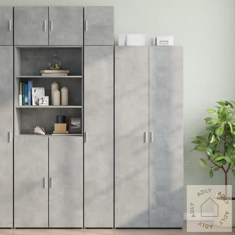 Skruer og plugger for veggmontering følger ikke med. Velg fester som passer til nettopp din veggtype, og kontakt en profesjonell ved behov. Les og følg alltid monteringsinstruksjonene nøye.Farge: betonggråMateriale: konstruert treSamlet mål: 30 x 42,5 x 225 cm (B x D x H)Mål lite skap: 30 x 42,5 x 40 cm (B x D x H)Mål stort skap: 30 x 42,5 x 185 cm (B x D x H)Antall rom: 8Montering kreves: ja