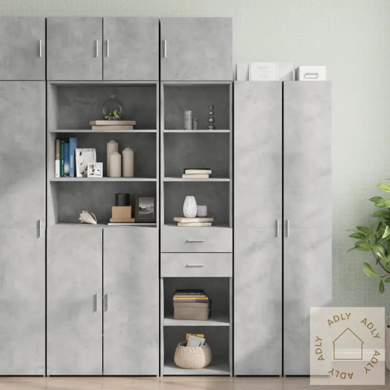 Skruer og plugger til veggmontering følger ikke med. Velg skruer og plugger som passer din veggtype for trygg montering. Er du usikker anbefaler vi å spørre fagfolk, og følg alltid monteringsanvisningen nøye.Farge: betonggrå – et moderne og allsidig uttrykk som enkelt matcher både andre møbler og utendørsmøbler.Materiale: konstruert treSamlet mål: 45 x 42,5 x 225 cm (B x D x H)Mål lite skap: 45 x 42,5 x 40 cm (B x D x H)Mål stort skap: 45 x 42,5 x 185 cm (B x D x H)Antall rom: 6Antall skuffer: 2Montering kreves: ja, dette gir deg fleksibilitet til å plassere skapet der det passer best sammen med både inne- og hagemøbler.