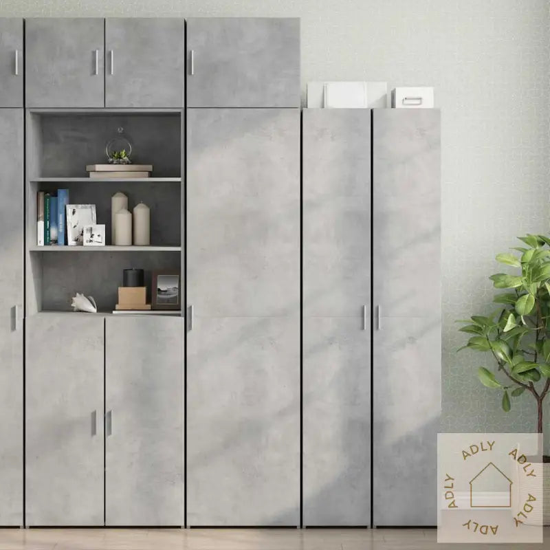 Skruer og plugger til veggmontering følger ikke med. For best resultat bør du bruke festemidler som passer din veggtype – sjekk gjerne med en fagperson hvis du er i tvil. Husk å følge monteringsanvisningen nøye.Farge: betonggråMateriale: konstruert treSamlet mål: 50 x 42,5 x 225 cm (B x D x H)Mål på lite skap: 50 x 42,5 x 40 cm (B x D x H)Mål på stort skap: 50 x 42,5 x 185 cm (B x D x H)Antall rom: 8Montering kreves: ja