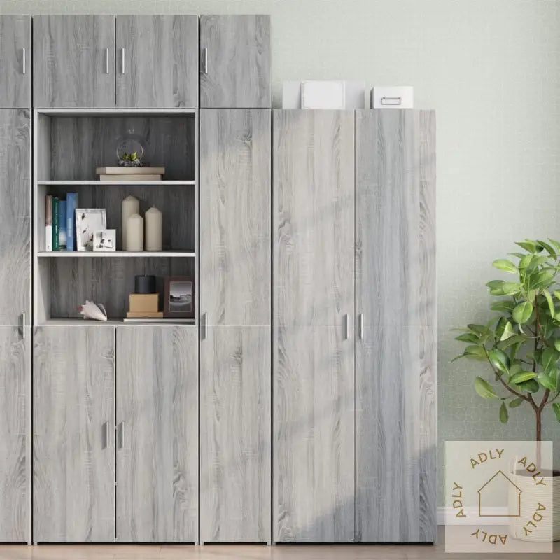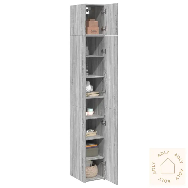Skruer og plugger for å feste skapet i veggen er ikke inkludert. Sørg for å bruke festemateriell som passer til akkurat dine vegger, og rådfør deg gjerne med en fagperson dersom du er usikker. Les alltid instruksjonene nøye.Farge: grå sonomaMateriale: konstruert treSamlet mål: 30 x 42,5 x 225 cm (B x D x H)Mål lite skap: 30 x 42,5 x 40 cm (B x D x H)Mål stort skap: 30 x 42,5 x 185 cm (B x D x H)Antall rom: 8Montering kreves: ja