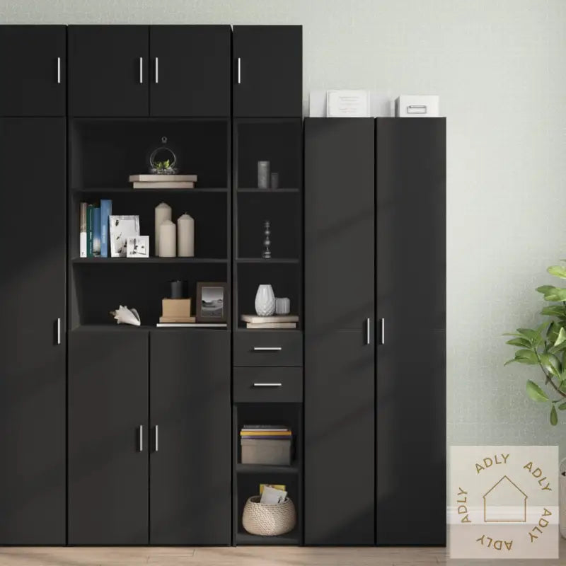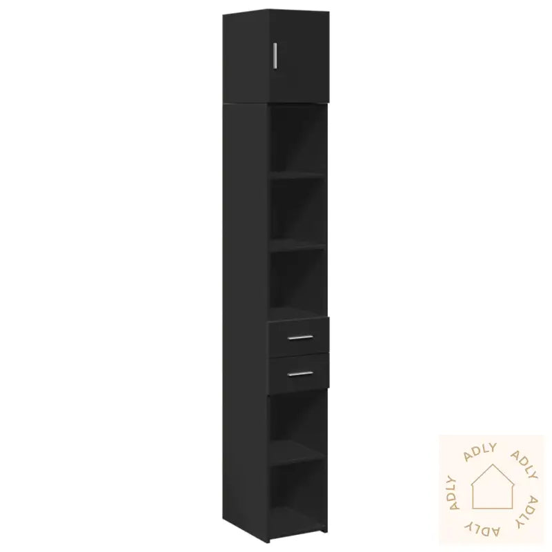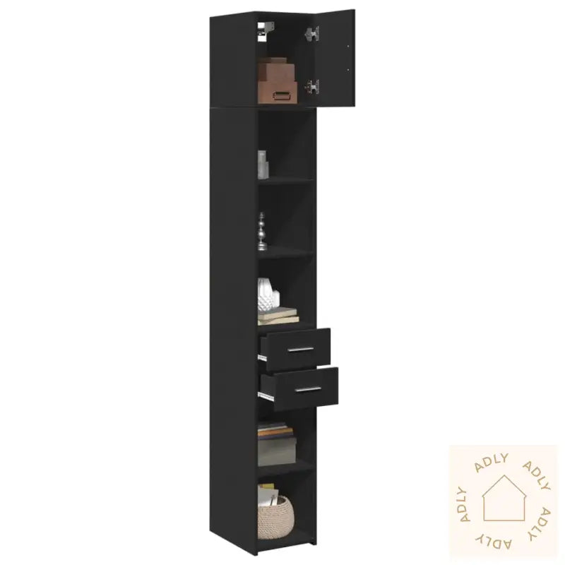 Farge: svartMateriale: konstruert treTotale mål: 30 x 42,5 x 225 cm (B x D x H)Mål lite skap: 30 x 42,5 x 40 cm (B x D x H)Mål stort skap: 30 x 42,5 x 185 cm (B x D x H)Antall rom: 6Antall skuffer: 2Montering nødvendig: ja