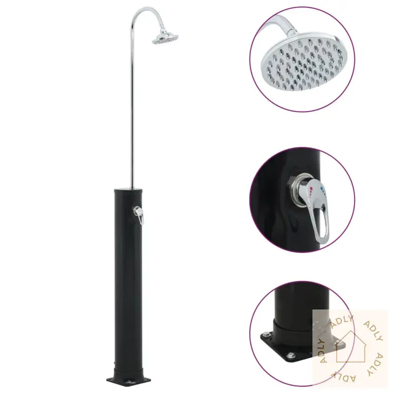 Farge: svartMaterialer: PVC, rustfritt stålMål plate: 19,5 x 19,5 cm (L x B)Høyde: 214 cmKapasitet vann: 20 LBruker solenergi til å varme vannetVannet kan varmes opp til 60 ℃Praktisk temperaturinnstilling for å lett kontrollere varmt eller kaldt vannKobles til vanlig hageslange, ingen ekstra vvs nødvendigMontering kreves: ja