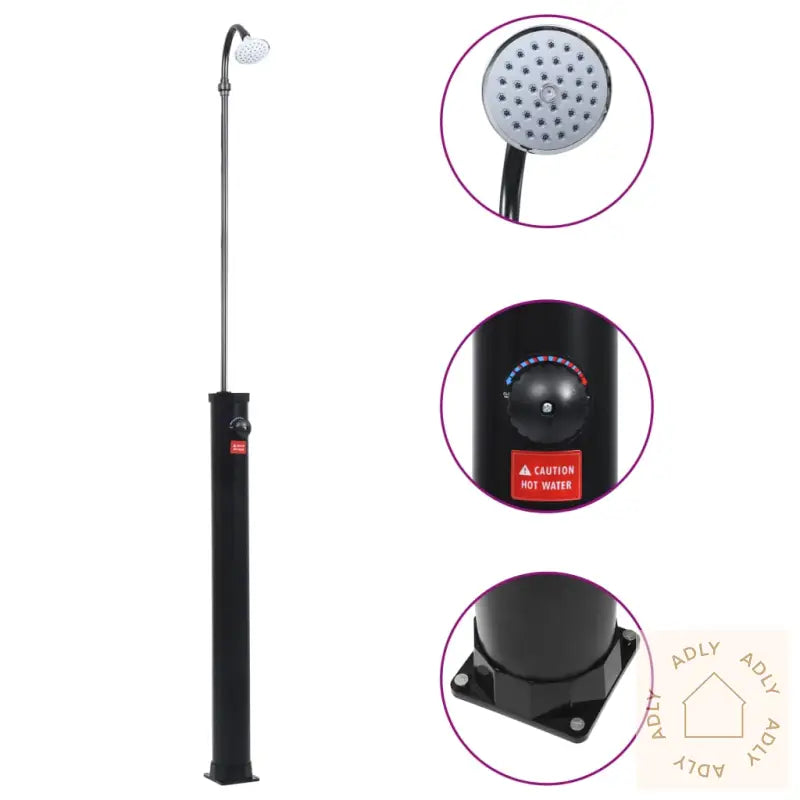 Farge: svartMaterialer: PVC, ABSMål base: 12,5 x 12,5 cm (L x B)Høyde: 215 cmKapasitet vanntank: 8 LDiameter nedre rør: φ 110 mmDiameter dusjhode: φ 100 mmVanntrykk: opptil 3,0 barBruker solenergi til å varme vannetPlasthåndtakInnløp 1/2" hurtigkoblingMontering kreves: ja
