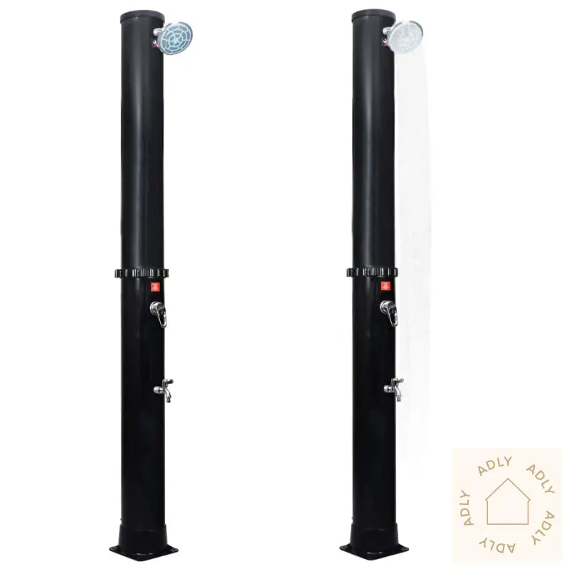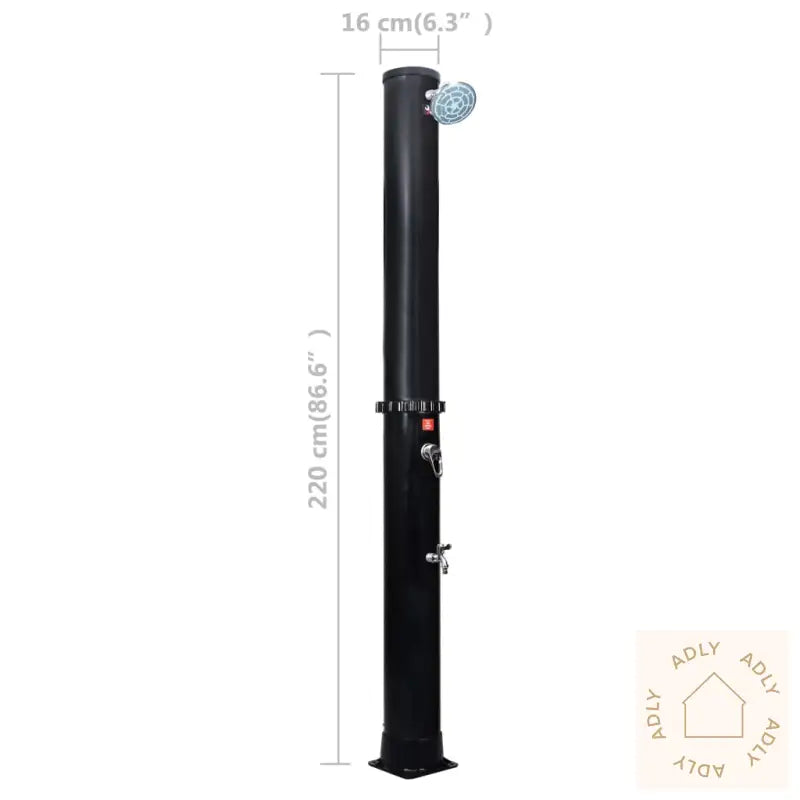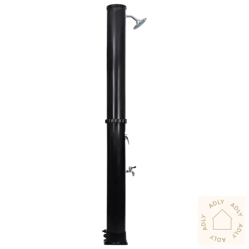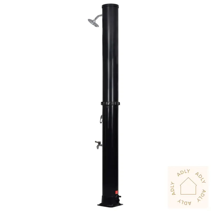 Farge: svartMaterialer: PVC, aluminium, messingSamlet mål: 16 x 220 cm (Diameter x H)Diameter dusjhode: 15 cmKapasitet vanntank: 40 LMonteringsskruer inkludertMed hode- og fotdusjUV-bestandigMontering kreves: ja