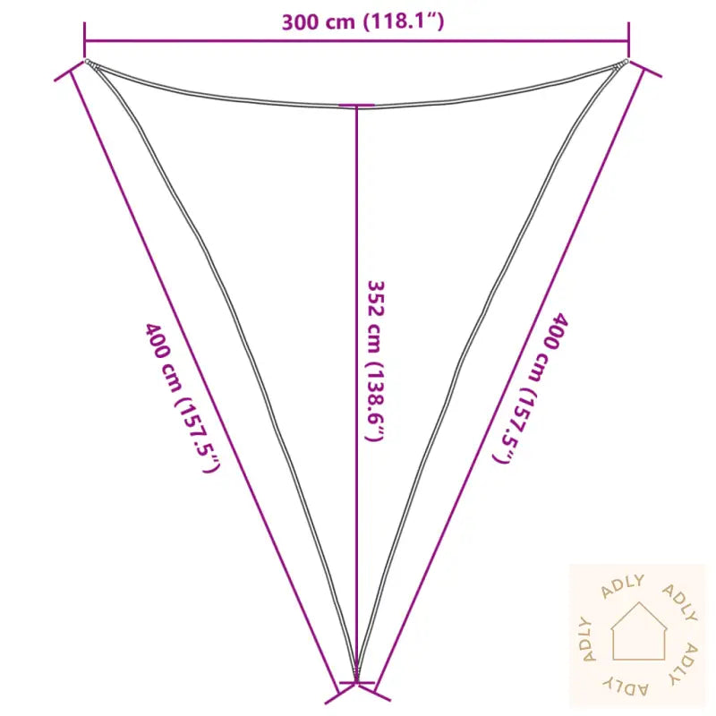 Farge: mørkegrønnMateriale: 100% HDPE (høytetthetspolyetylen)Mål: 3 x 4 x 4 mForm: trekantetCa. 90% UV-beskyttelseVindtett og vanngjennomtrengelig for bedre inneklima under seiletMugg- og UV-sikkert, pustende HDPE-materialeRustfrie stålfester i hvert hjørne for enkel montering3 x 1,5 m PE-tau følger med
