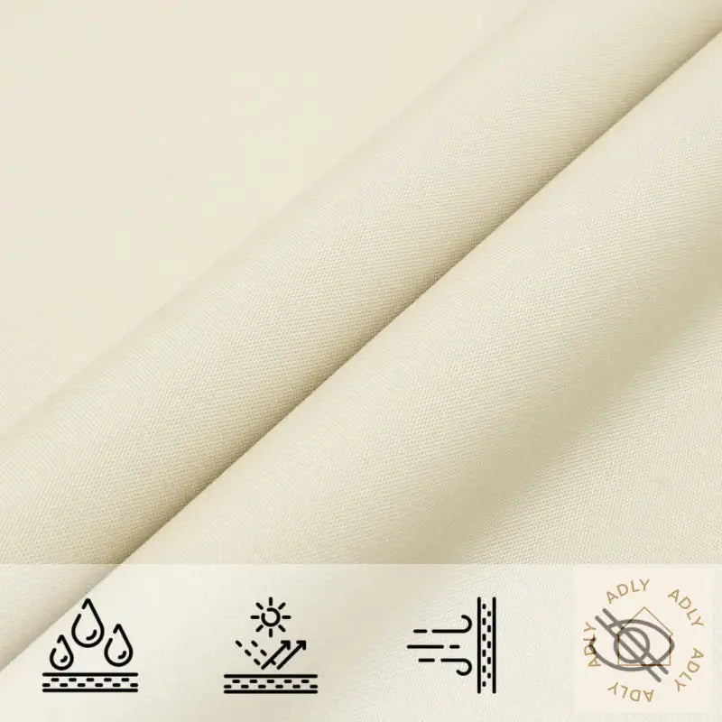 Farge: kremhvitMateriale: PU-belagt oxfordstoffMål: 3 x 3 m (L x B)Form: firkantetVannbestandigUV-beskyttendeFester i rustfritt stål i hvert hjørne4 x 1,5 m PE-tau er inkludert