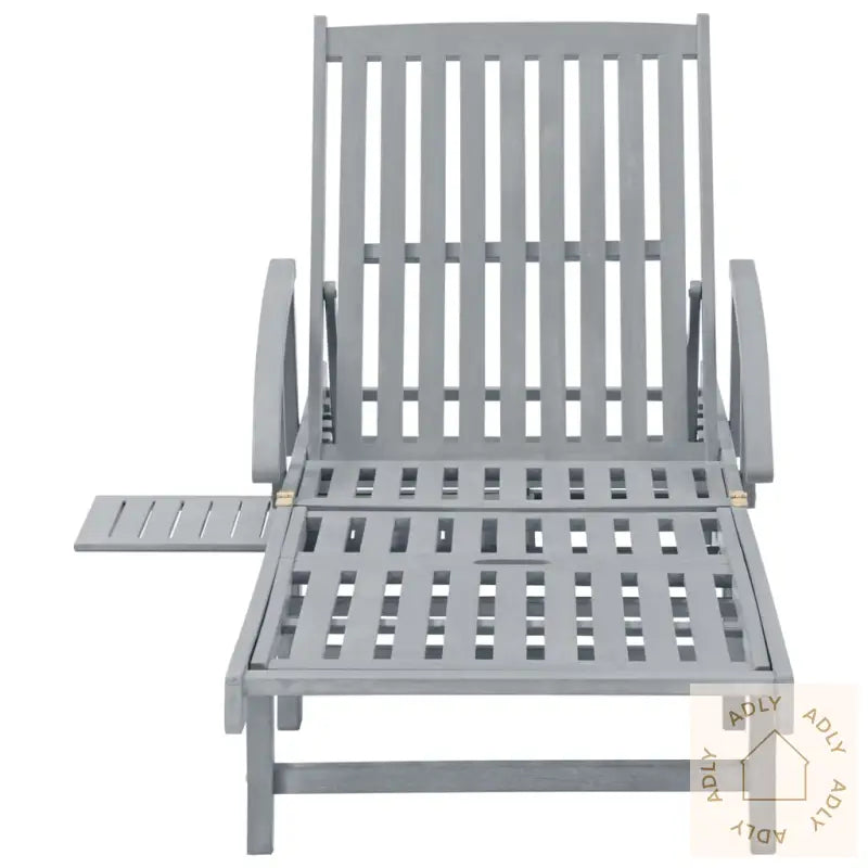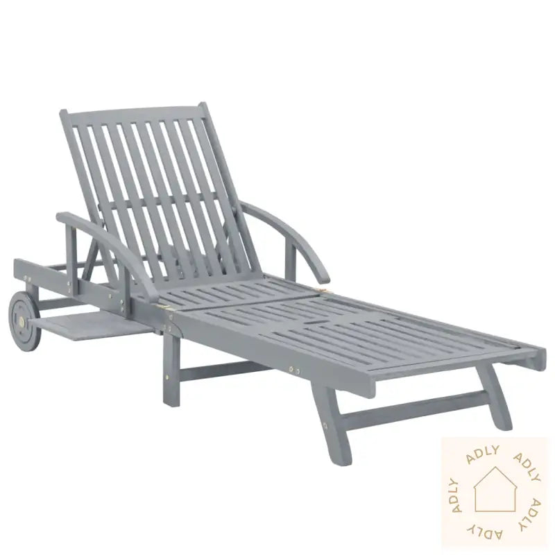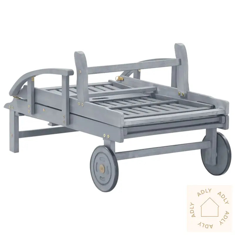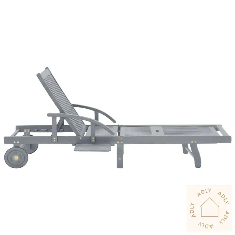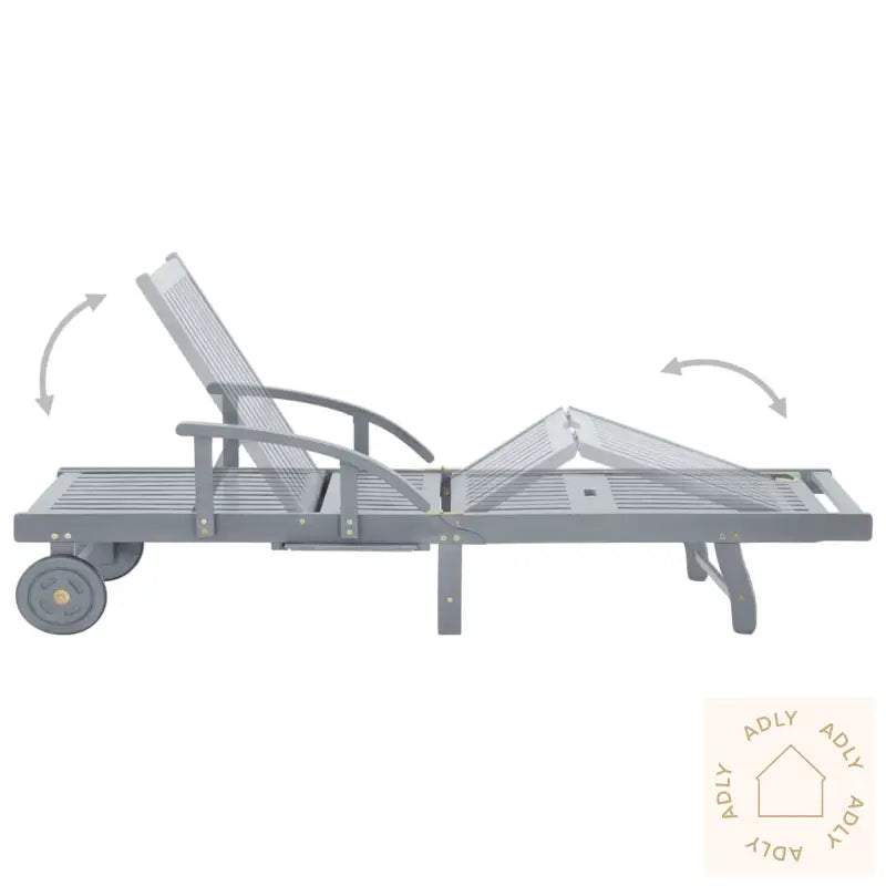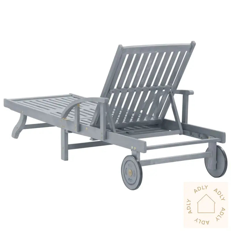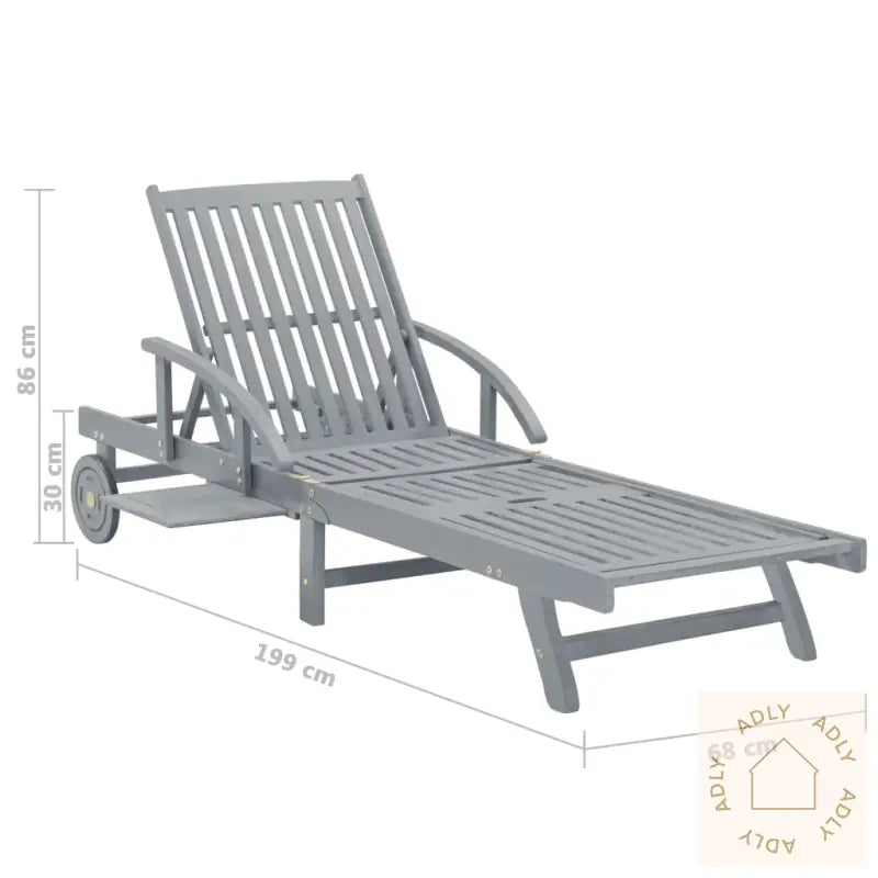 Farge: gråMateriale: heltre akasieMål: 199 x 68 x 30/86 cm (B x D x H)Justerbar rygg- og fotstøtte for optimal komfortLett å flytte med innebygde hjulVærbestandig og enkel å rengjørePute inkludert: nei