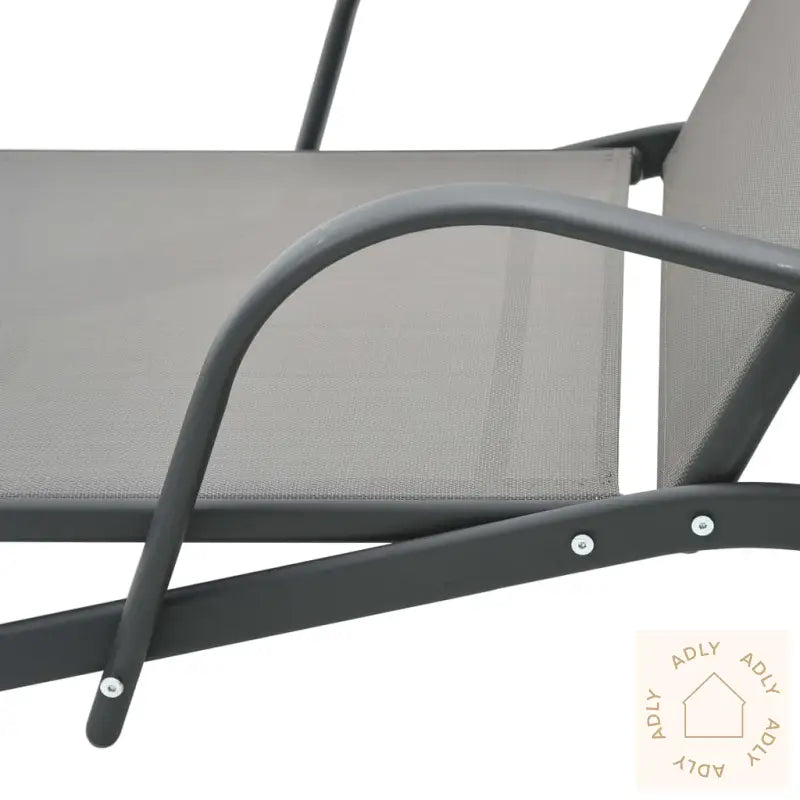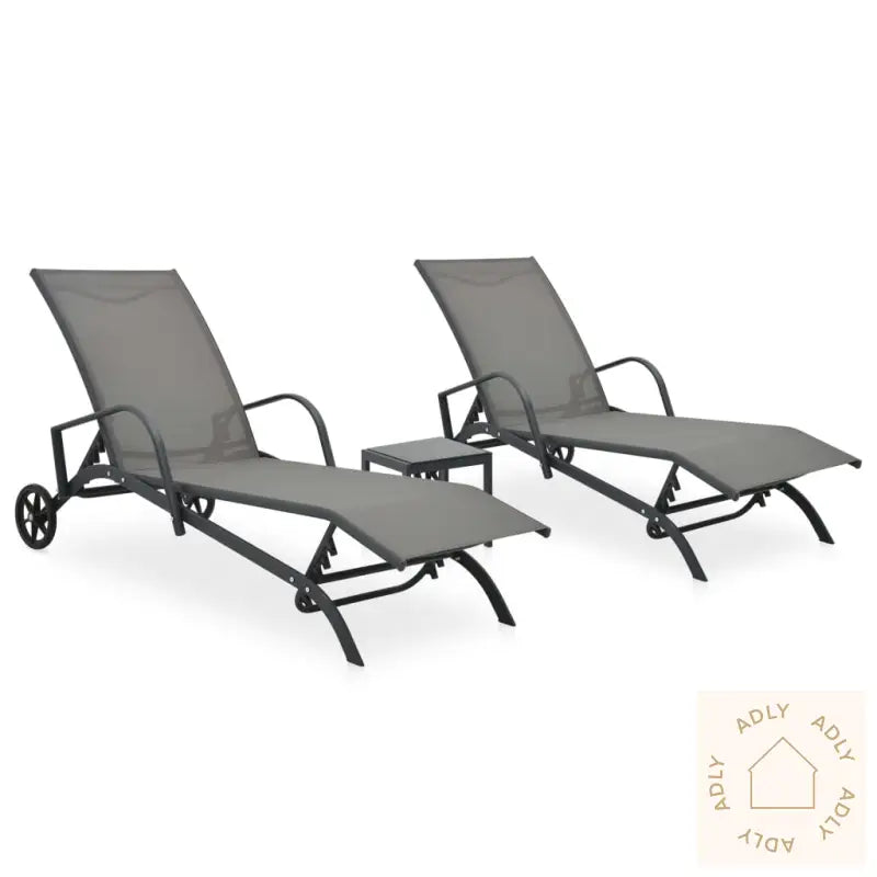 Farge: gråMaterialer: textilene, stålMål solseng: 178 x 60 x 37 cm (L x B x H)Mål bord: 30 x 30 x 29,5 cm (L x B x H)Justerbar ryggstøtte – for personlig komfortMontering kreves: jaLeveransen inneholder:2 x solsenger1 x tebord
