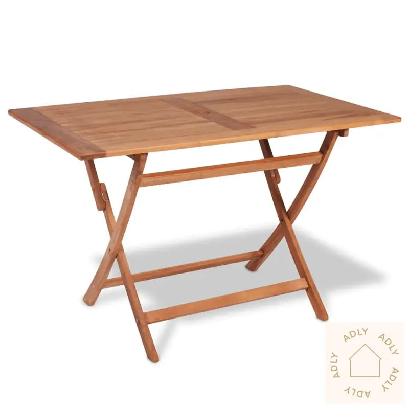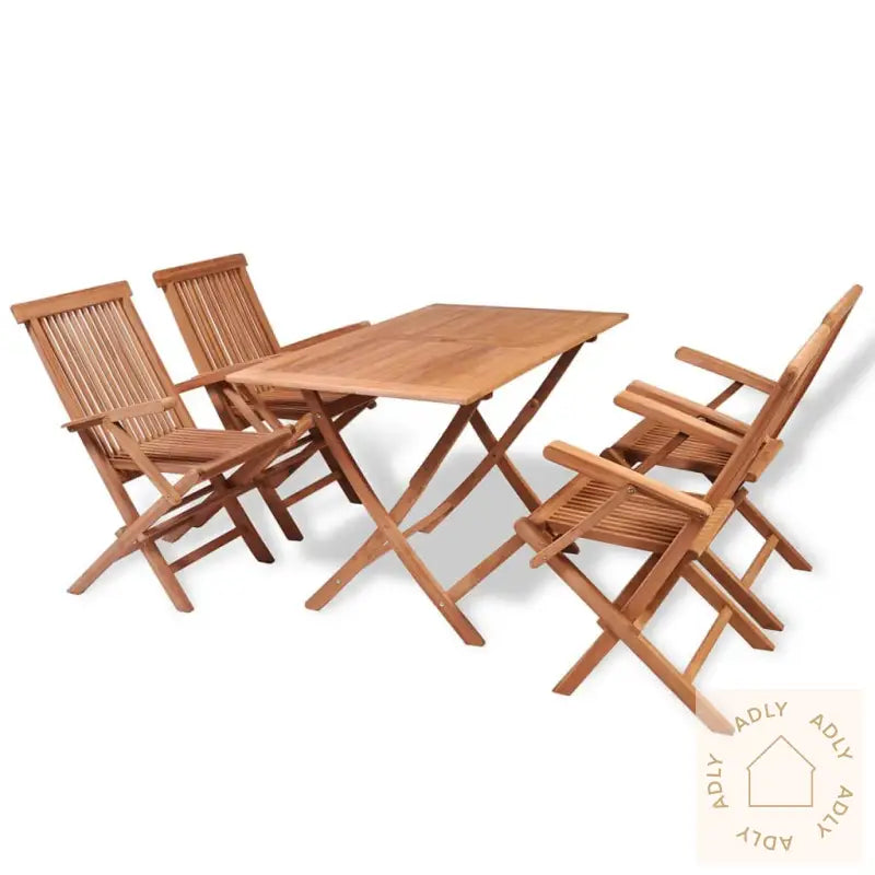 Materialer: finslipt teak løvtre med vannbasert finishMål bord: 120 x 70 x 75 cm (L x B x H)Mål stol: 55 x 60 x 89 cm (B x D x H)Sammenleggbar for enkel lagring og transportLeveransen inkluderer: 1 x rektangulært, sammenleggbart bord, 4 x sammenleggbare stoler