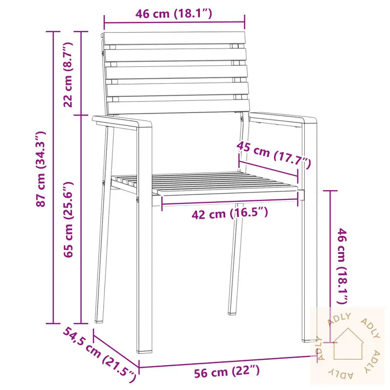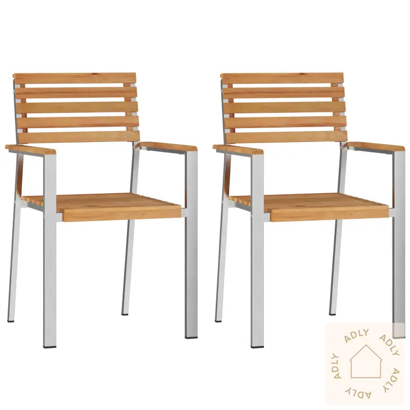 Holdbar konstruksjon: Robust solid teak gjør disse hagemøblene ekstra motstandsdyktige mot regn og sol, samtidig som de holder seg pene lenge. Dette betyr mindre vedlikehold og mer tid til avslapning.Moderne stil: Det stilrene uttrykket kombinerer det varme preget fra treverket med en matt, industriell touch fra metallet – designvalg som skaper et trendy midtpunkt utendørs.Stablingsvennlig design: Du sparer enkelt plass når sesongen er over, siden stolene kan stables og oppbevares uten å ta opp mye rom. Praktisk for små områder!Ergonomisk komfort: Stolene har et bredt sete, gode armlener og 45 cm ryggstøtte for å gi ekstra sittekomfort under alt fra middager til lange sommerkvelder med venner.Allsidig bruk: Perfekte som møbler til hjemmet ditt når du vil gjøre mer ut av uterommet – nyt både hagefester, morgenkaffen eller rolige stunder i hagen med god sittekomfort.Antall: 2Farge: BrunForm: RektangulærMateriale: Massiv teakOverflate: MattInnendørs/Utendørs: Kun utendørsBeskyttelse inkludert: NeiRom: Garten und TerrassegBatterier inkludert: NeiMaksimalt antall personer: 2Maksimal vekt: 100 kgBenhøyde: 45 cmSetedybde: 46 cmSittekapasitet: 1Gynger: NeiMerke: Leveransen inneholder: 2 stolerMontering kreves: JaAnbefalt antall personer for montering: 1