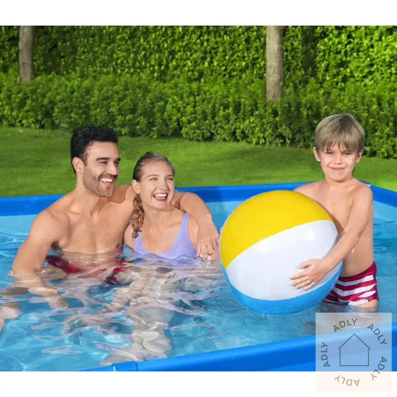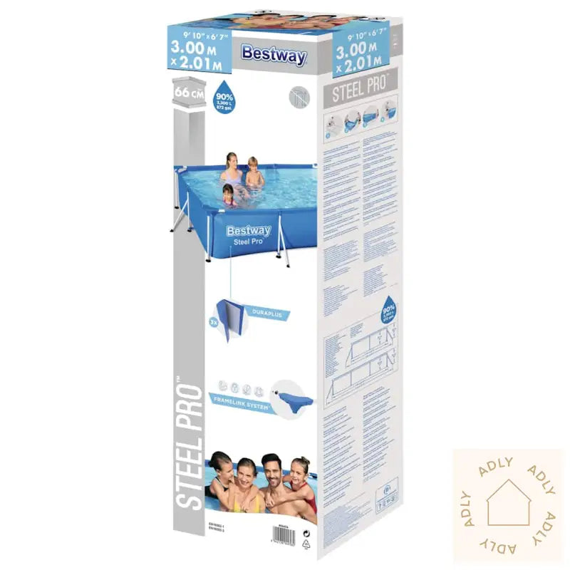 Farge: blåSlitesterk, korrosjonsbestandig stålramme3-lags sidevegger av kraftig PVC og polyester for ekstra styrkeMål: 300 x 201 x 66 cm (L x B x H)Kapasitet (90%): 3300 L (827 gal)Settes opp på rundt 20 minutterInnebygd dreneringsventil for enkel vannreguleringUndervannsreparasjonslapp inkludertLett å sette opp og ta ned – praktisk for lagringMontering kreves: jaBestway varenummer: 56404