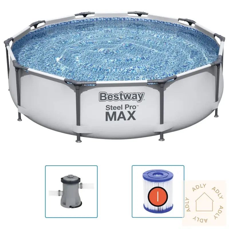 Svømmebasseng:Farge: gråMateriale: Tritech-materiale og stålMål: 305 x 76 cm (Diameter x H)Form: rundVannkapasitet: 4678 L (1236 gal) (90%)Ekstra kraftige 3-lags sideveggerKorrosjonsbestandig stålramme for lengre levetidTåler UV-stråling og klor – smart for solfylte hagerEnkel å montereFilterpumpe:Pumpekapasitet: 1249 L/t = 330 gal/tStrømforsyning: 220-240 V~, 50 HzEffekt: 16 WBestway varenummer: 56408Leveransen inneholder:1 x svømmebasseng1 x filterpumpe1 x reparasjonslapp