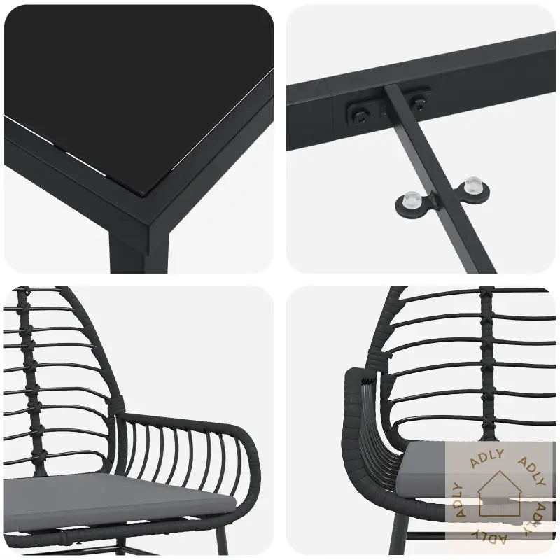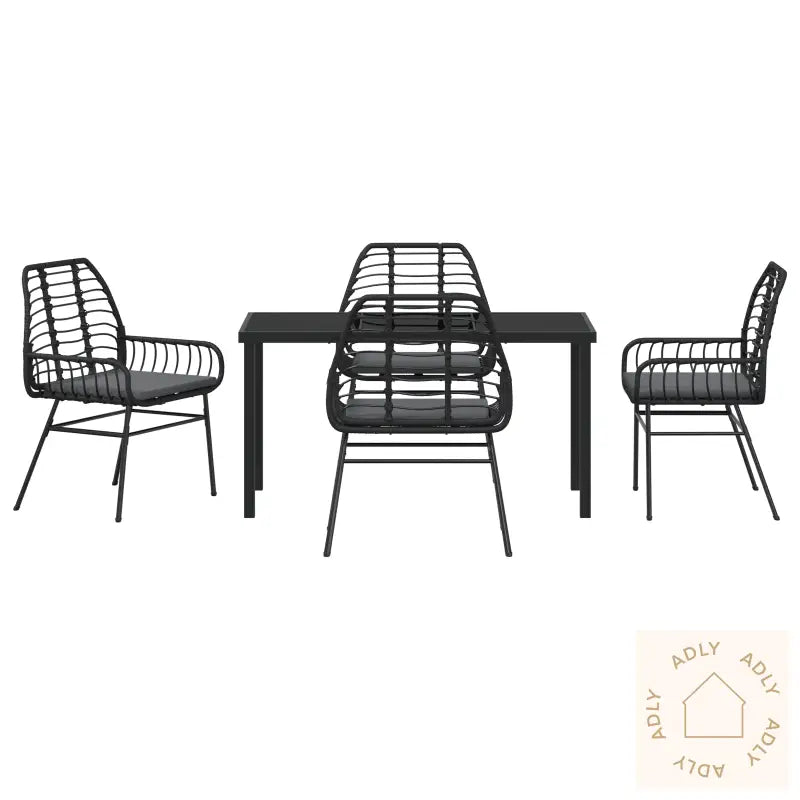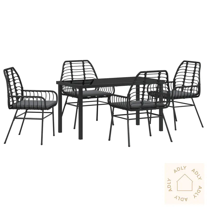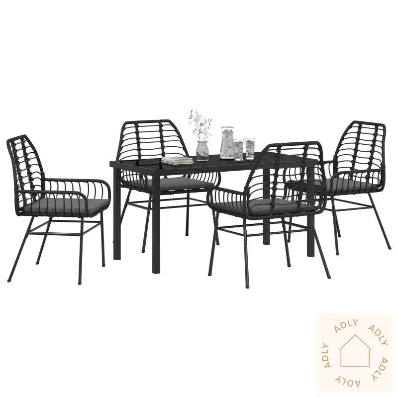Komfortable seter: De tykke, myke putene sørger for en avslappende utendørs sitteopplevelse, enten du nyter morgenkaffen eller inviterer venner til sommermiddag.Holdbar konstruksjon: Det robuste, syntetiske poly rattan-materialet er laget for å holde seg pent lenge, uten at det krever mye vedlikehold.Moderne design: Settet har et tidløst og stilrent utseende som gjør at det enkelt passer inn blant andre møbler til hjemmet og gir uterommet et moderne preg.Lett å flytte: Takket være den lette konstruksjonen er både stoler og bord enkle å endre plassering på, enten du skal rydde plass for fest eller ommøblere på terrassen.Enkelt vedlikehold: Trekkene på putene kan tas av og vaskes i maskin, så du holder møblene rene uten stress.Antall elementer: 5Farge: SvartForm: RektangulærMateriale: Syntetisk poly rattanFinish: PulverlakkertPassert for: Utendørs bruk (ikke innendørs)Pute-trekk inkludert: JaPlassering: Hage og terrasseBatterier inkludert: NeiHodegjerde inkludert: NeiKapasitet: 110Maksimalt antall personer: 4Maksimal vekt pr. person: 110 kgBeinhøyde: 44 cmSetedybde: 48 cmSetekapasitet pr. stol: 1Gyngefunksjon: NeiStige inkludert: NeiMerke: Leveres med: 4 x stol, 1 x bordMontering kreves: JaAnbefalt antall personer til montering: 2