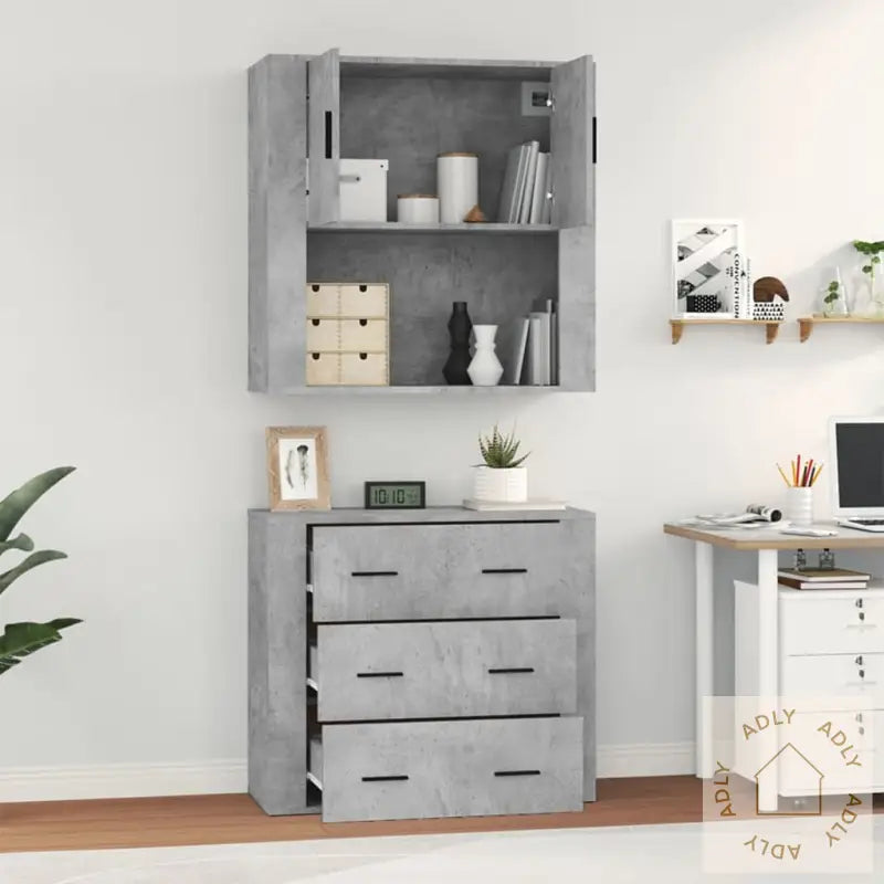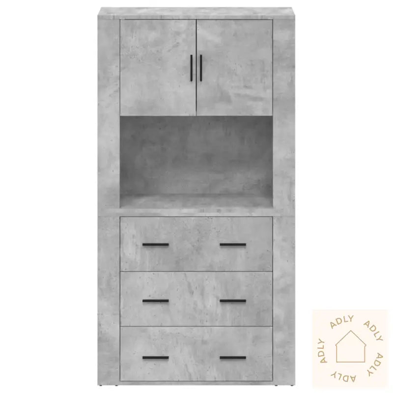 For å forhindre at møbelet velter må du bruke den medfølgende festeanordningen, slik at både sikkerheten og holdbarheten ivaretas.Farge: BetonggråMateriale: Konstruert treMål skjenk: 80 x 33 x 70 cm (L x B x H)Mål topp for highboard: 80 x 33 x 80 cm (L x B x H)Leveransen inneholder:1 x skjenk1 x topp for highboardLegal Documents: