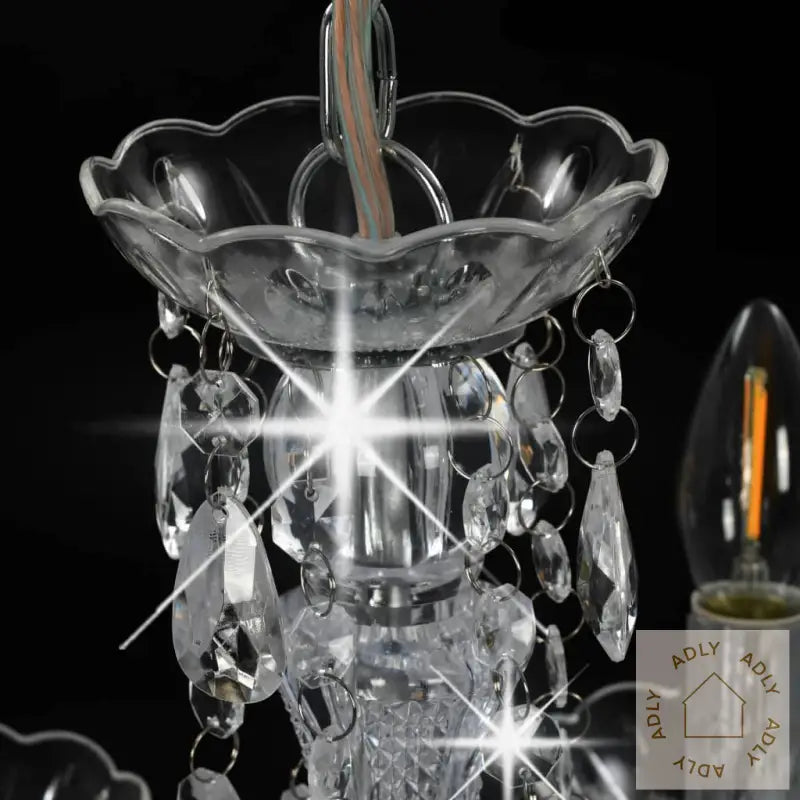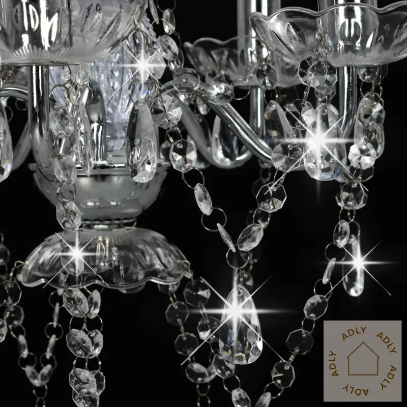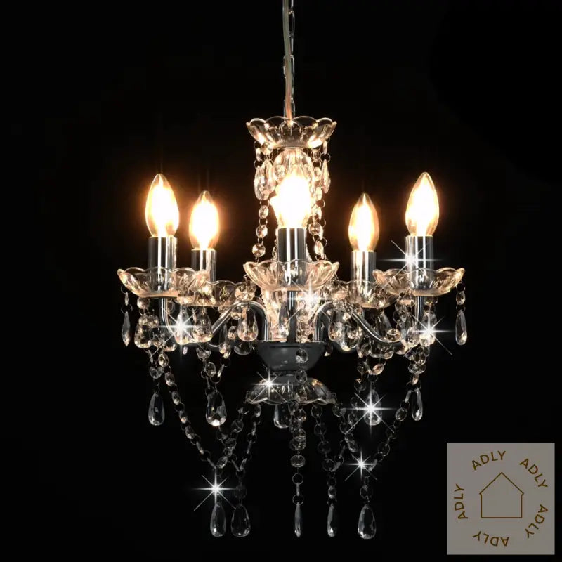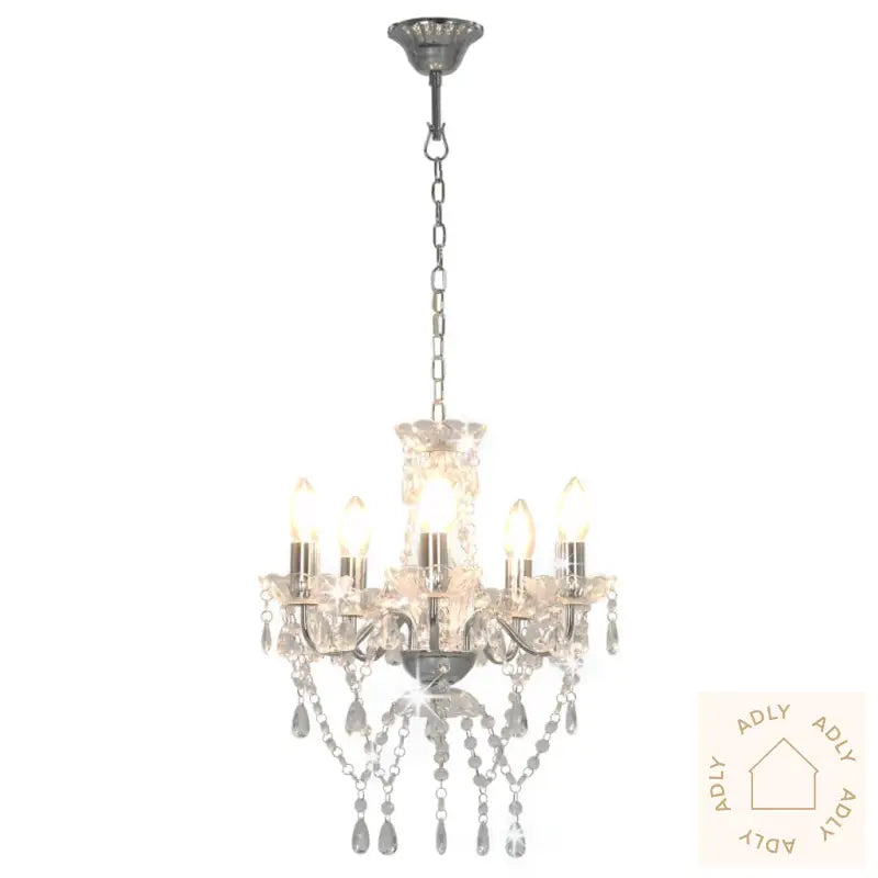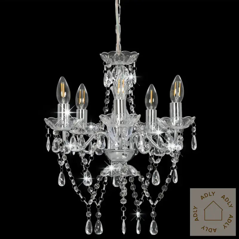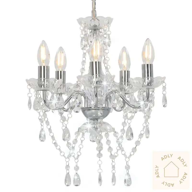 Farger: sølv (lampebase) + gjennomsiktig (perler)Materialer: metall (lampebase) + akryl (perler)Mål: 38 x 42 cm (Diameter x H)Strømforsyning: 220 VType sokkel: E14Med 5 lyspærebaserLyspærer ikke inkludert