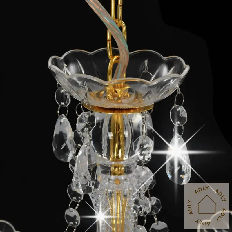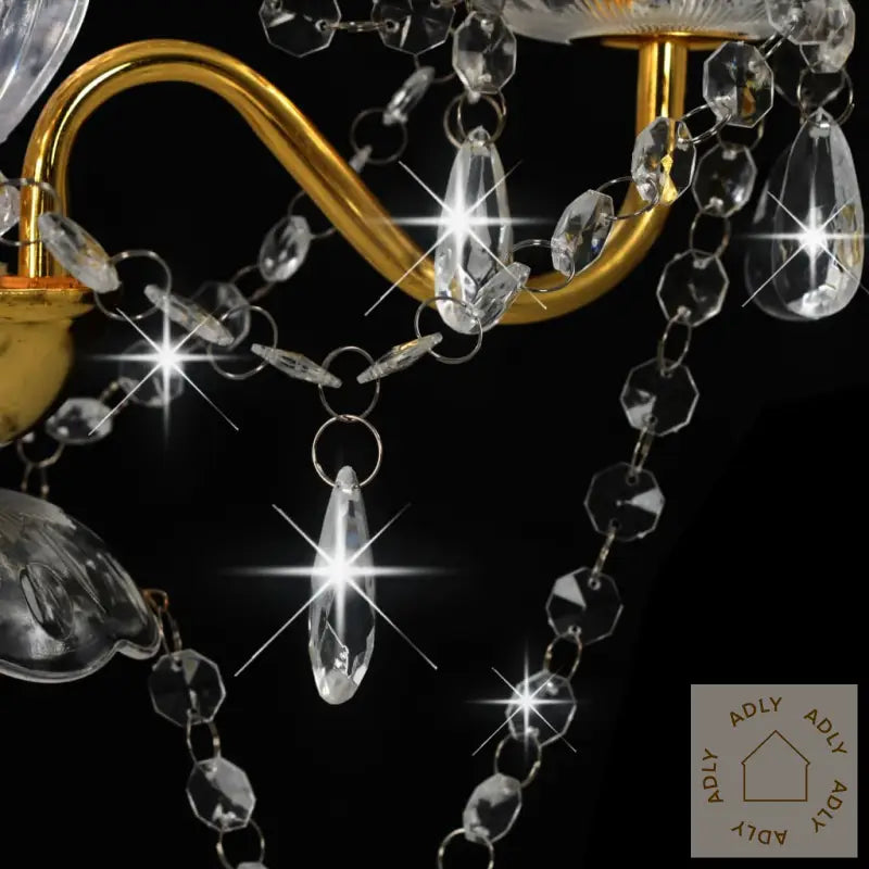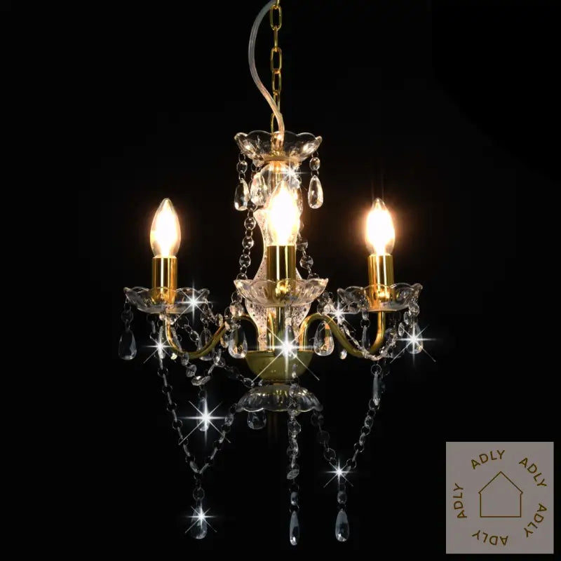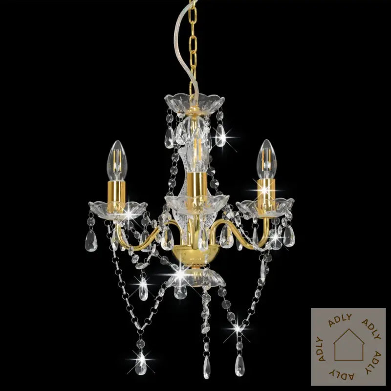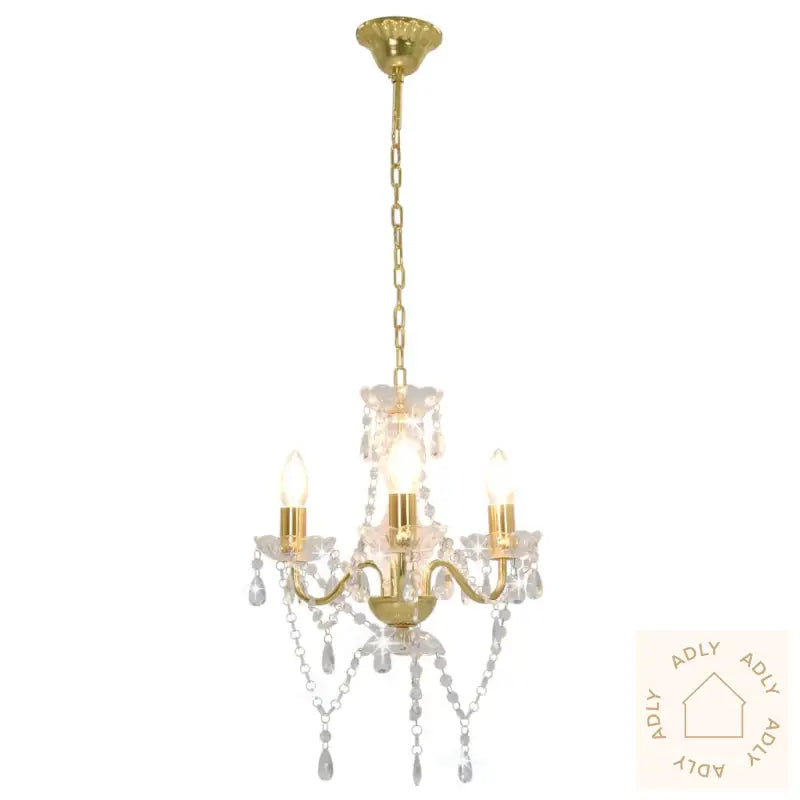 Farger: gyllen (lampebase) + gjennomsiktig (perler)Materialer: metall (lampebase) + akryl (perler)Mål: 36 x 42 cm (Diameter x H)Strømforsyning: 220 VType sokkel: E14Med 3 lyspærebaserLyspærer ikke inkludert