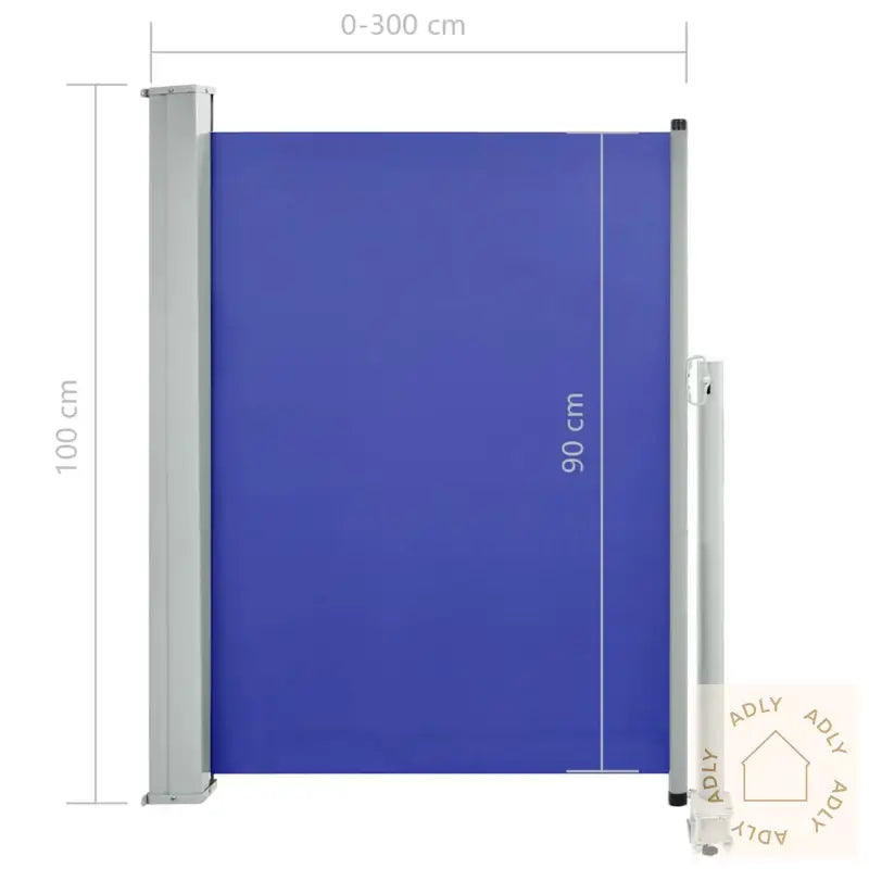 Farger: Blå solskjerm og grått stativMateriale: Stoff (100% polyester) med PU-belegg kombinert med pulverlakkert jernMål: 100 x 0-300 cm (H x B)Høyde skjerm: 90 cm