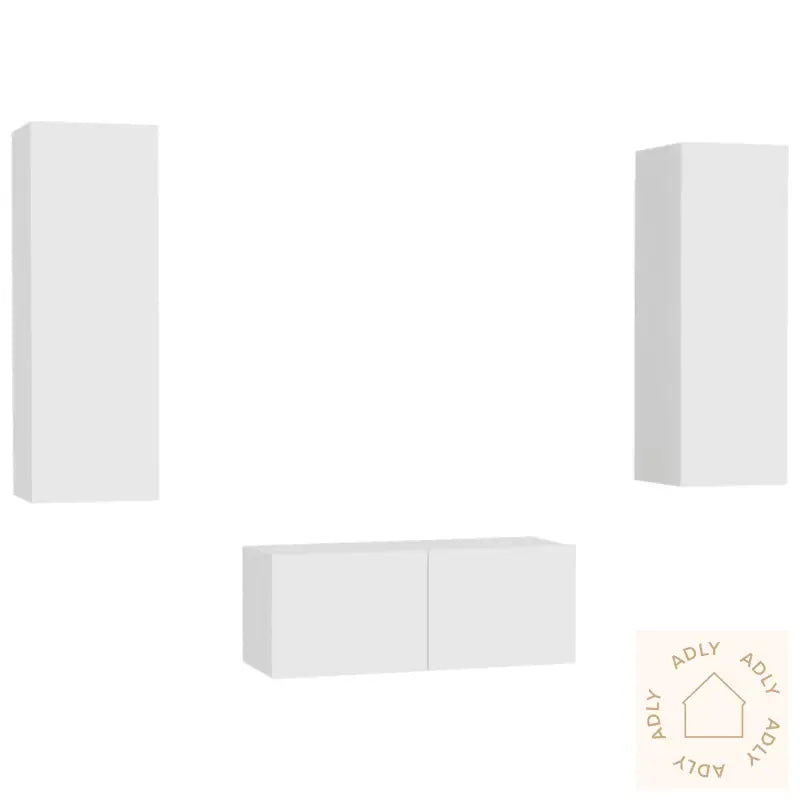 Farge: hvitMateriale: konstruert treMål (L): 80 x 30 x 30 cm (B x D x H)Mål (M): 30,5 x 30 x 90 cm (B x D x H)Montering kreves: jaLeveransen inneholder:1 x TV-benk (L)2 x TV-benker (M)