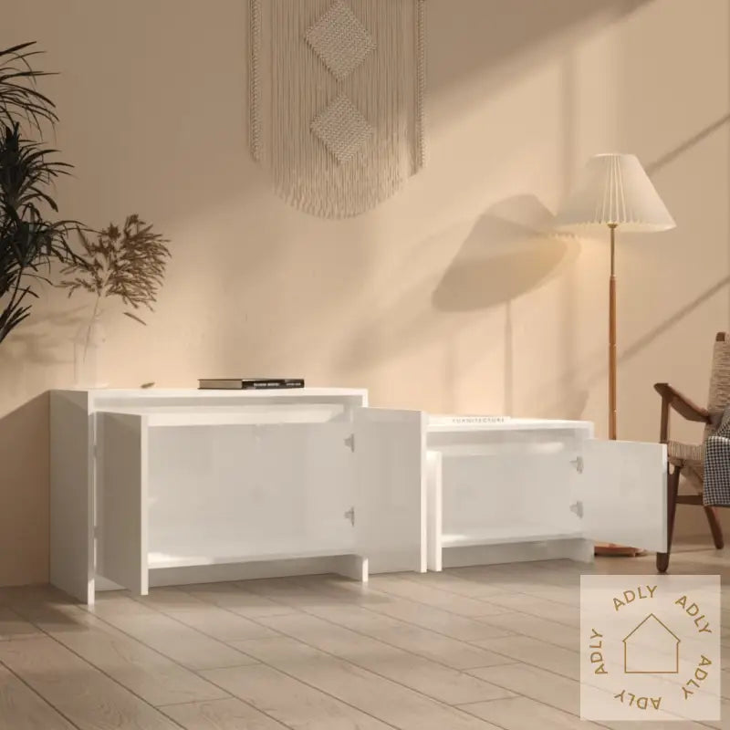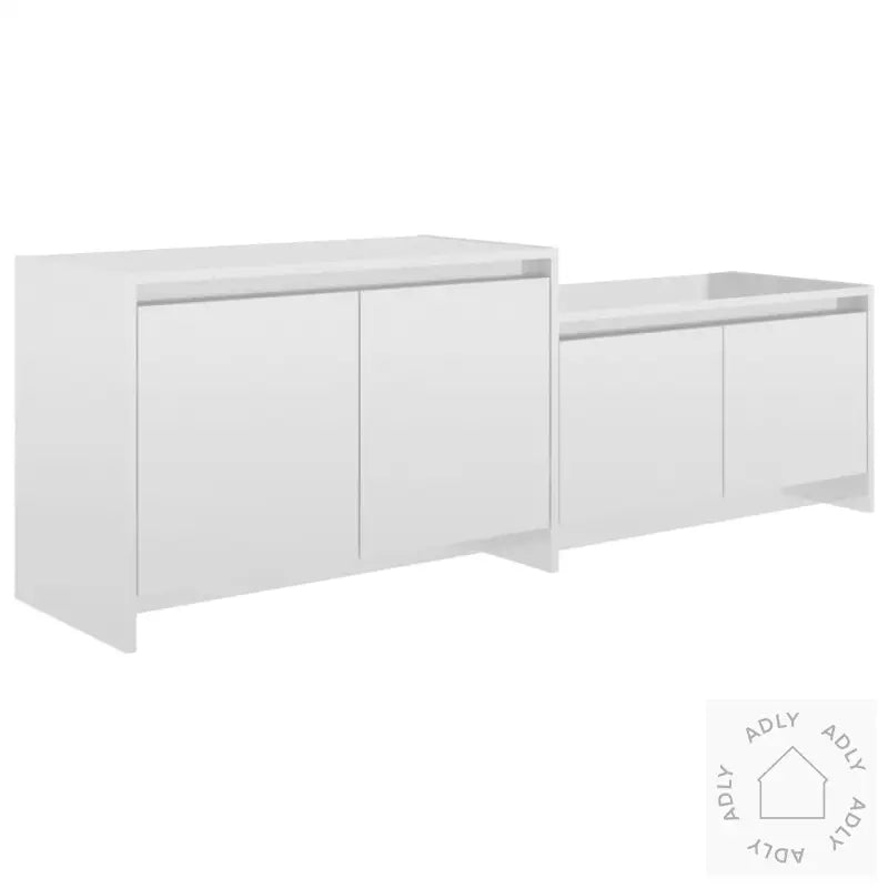 Med sin solide og slitesterke konstruksjon tåler denne skjenken daglig bruk, og holder seg pen lenge. De 4 dørene skjuler god oppbevaringsplass som gjør det enkelt å holde DVD-er, spillkonsoller, magasiner og alt du ønsker å organisere ryddig og samlet. Skapet består av 2 separate deler, slik at du fleksibelt kan montere modulene enten til høyre eller venstre ut fra hva som passer best til din stue og dine øvrige møbler. Den høyglans hvite finishen gir et elegant løft, mens det konstruerte treverket gir en solid utførelse.