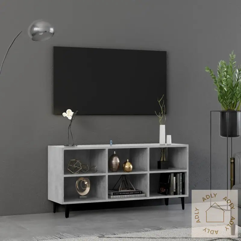 Farge: betonggråMaterialer: konstruert tre, metallMål: 103,5 x 30 x 50 cm (L x B x H)Har fire metallbenInkluderer 6 romMontering kreves: jaADVARSEL: For å forhindre at produktet velter, må medfølgende festemidler for vegg brukes.