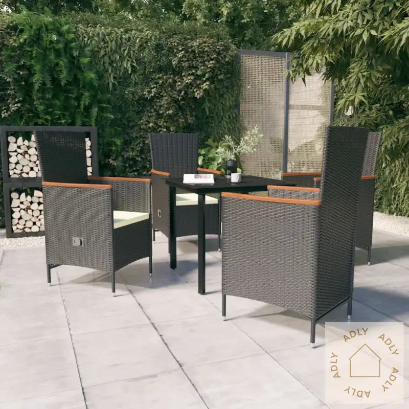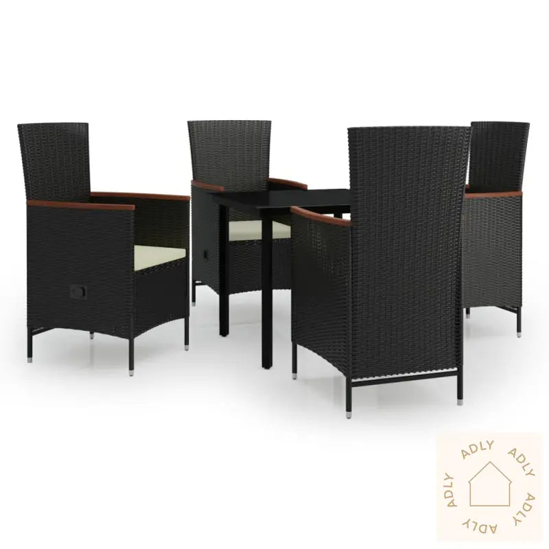 Farge: svartFarge pute: kremhvitMaterialer: PE-rotting, heltre akasie, pulverlakkert stål, glassMateriale putetrekk: 100 % polyesterMål bord: 80 x 80 x 74 cm (L x B x H)Mål stol (ikke tilbakelent): 58 x 62 x 108 cm (B x D x H)Mål stol (tilbakelent): 58 x 90 x 91 cm (B x D x H)Tykkelse pute: 5 cmBredde sete: 47 cmDybde sete: 47 cmHøyde sete fra bakken uten pute: 43 cmHøyde armlene fra bakken: 67 cmMontering kreves: jaLeveransen inneholder:1 x bord4 x stoler4 x seteputer
