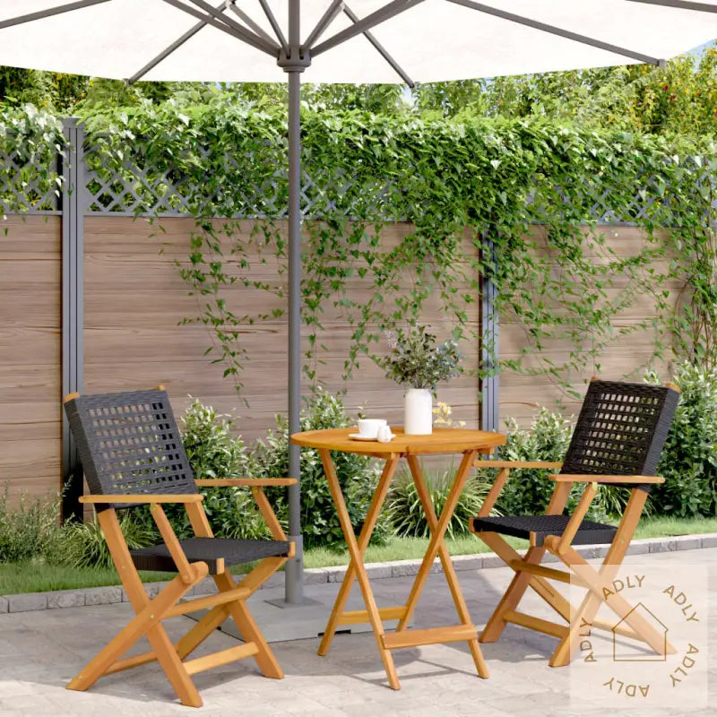 For å bevare utseendet og forlenge levetiden på dine hagemøbler anbefales det å bruke et vanntett trekk.Bord:Materiale: Oljebehandlet heltre akasieMål: 70 x 75 cm (Diameter x H)SammenleggbarHagestol:Farge: SvartMaterialer: Heltre akasie med oljefinish, PE-rottingMål: 54 x 57 x 91 cm (B x D x H)Mål sete: 40 x 38 cm (B x D)Høyde sete fra bakken: 44 cmHøyde armlene fra bakken: 65 cmMaksimal lastekapasitet (per sete): 110 kgPute inkludert: NeiMontering kreves: JaLeveransen inneholder:1 x hagebord2 x hagestoler