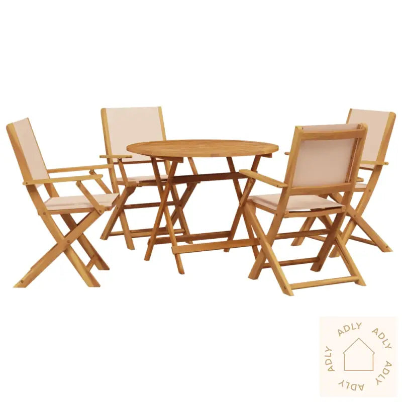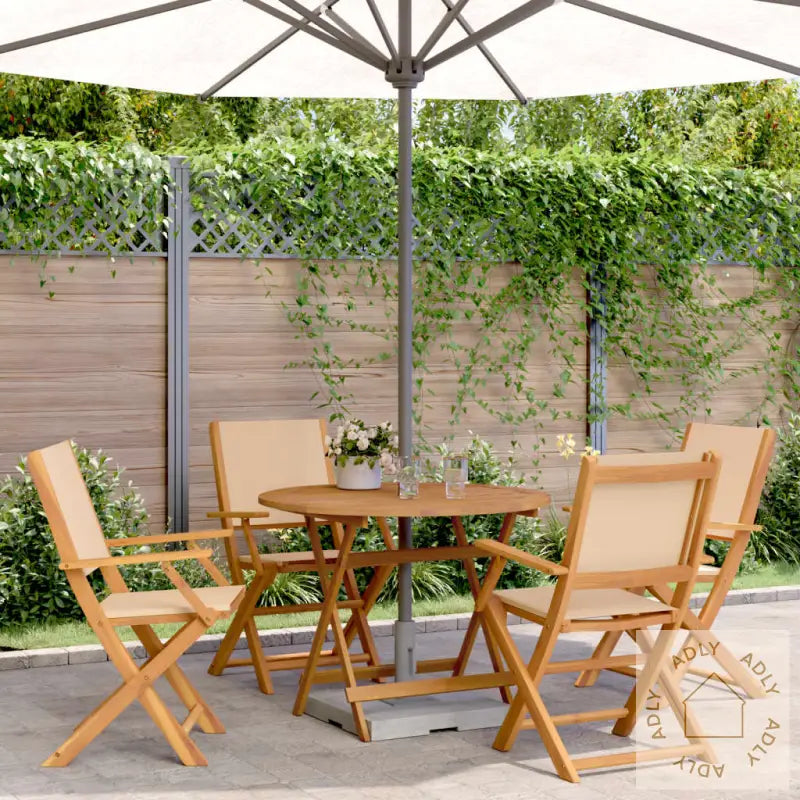 Vi anbefaler å bruke et vanntett trekk for å beskytte hagemøblene dine, slik at både heltre akasie og eventuelle tekstildeler holder seg fine lenger.Bord:Materiale: Oljebehandlet heltre akasieMål: 90 x 75 cm (diameter x H)Diameter på hull til parasoll: 5 cmSammenleggbartHagestol:Farge: BeigeMaterialer: Heltre akasie med oljefinish, stoff (100% polyester)Mål: 54 x 58 x 91 cm (B x D x H)Sittedel: 40 x 38 cm (B x D)Setehøyde fra bakken: 44 cmHøyde armlene fra bakken: 63 cmMaks vektkapasitet (per sete): 110 kgSittepute følger ikke medMontering krevesPakken inneholder:1 x hagebord4 x hagestoler