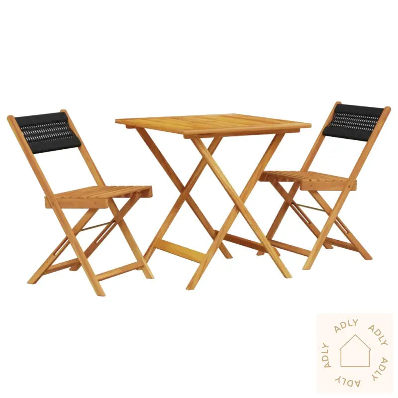 Bord:Materiale: oljebehandlet heltre akasieMål: 70 x 70 x 75 cm (L x B x H)SammenleggbarHagestol:Farge: svartMaterialer: heltre akasie med oljefinish, polypropylenSamlet mål: 41 x 52,5 x 102,5 cm (B x D x H)Mål sete: 38 x 35 cm (B x D)Høyde sete fra bakken: 44 cmMaksimal lastekapasitet (per sete): 110 kgPute inkludert: neiMontering kreves: jaLeveransen inneholder:1 x hagebord2 x hagestoler