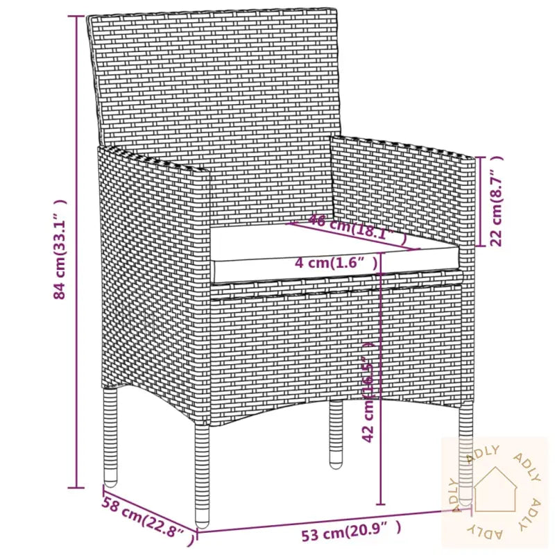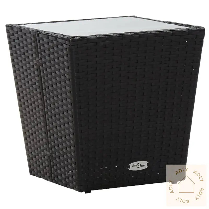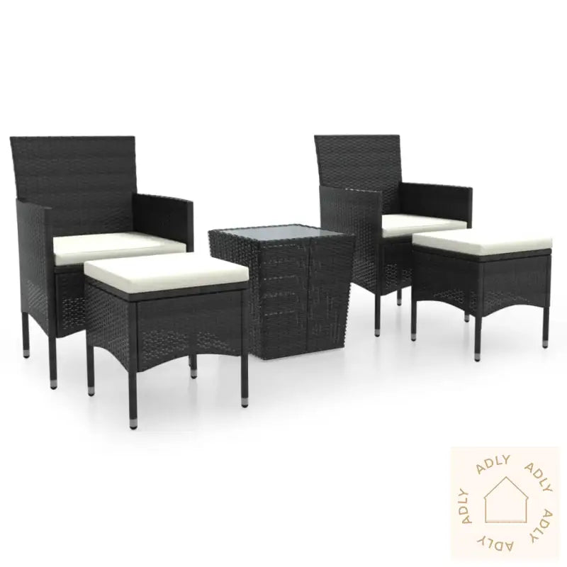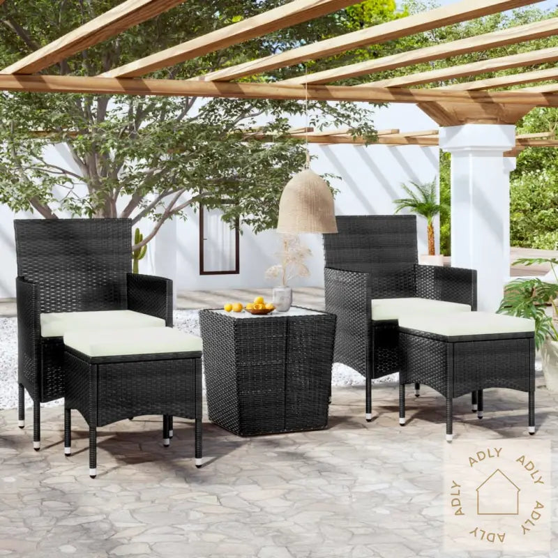 Farge: svartFarge pute: kremhvitMaterialer: polyrotting, pulverlakkert stål, stoff (100 % polyester)Materiale bordplate: herdet glassMål bord: 41,5 x 41,5 x 43 cm (B x D x H)Mål: 53 x 58 x 84 cm (B x D x H)Mål fotskammel: 41,5 x 41,5 x 42,5 (B x D x H)Høyde sete fra bakken: 42 cmMål sete: 39/44,5 x 46 cm (B x D)Høyde fra bakken armlene: 62/65 cmTykkelse setepute: 4 cmMontering kreves: jaLeveransen inneholder:1 x bord2 x stoler2 x fotskamler4 x seteputer