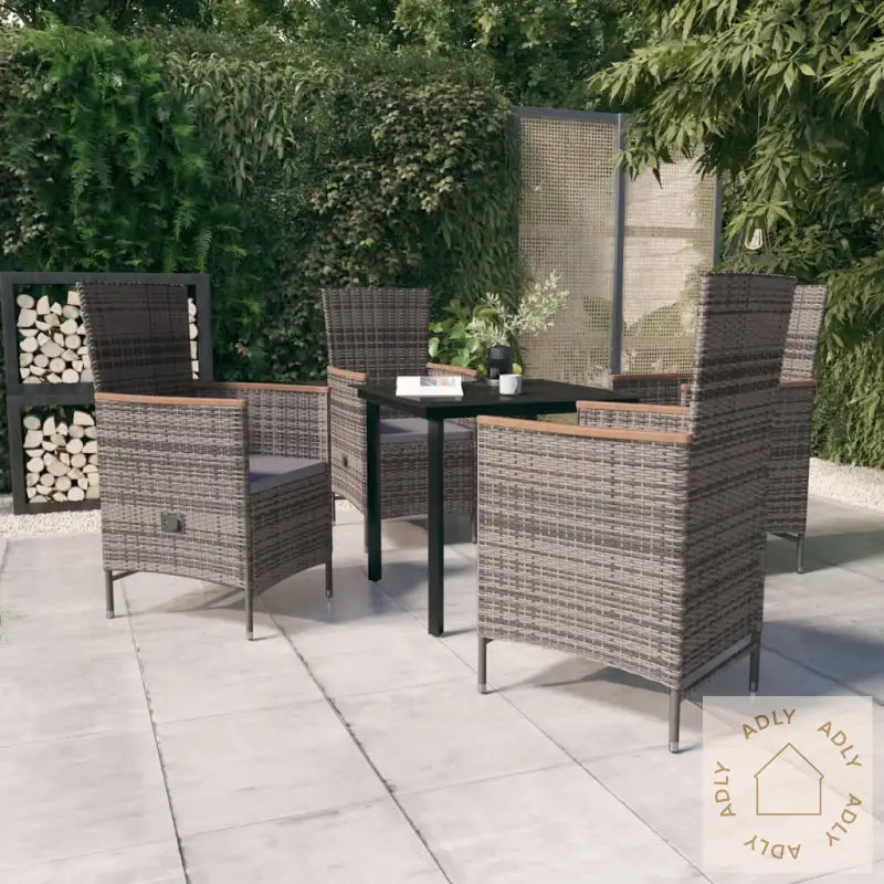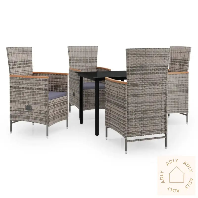 Farger: Grå og svartFarge pute: MørkegråMaterialer: PE-rotting, heltre akasie, pulverlakkert stål, glassMateriale putetrekk: 100 % polyesterMål bord: 80 x 80 x 74 cm (L x B x H)Mål stol (ikke tilbakelent): 58 x 62 x 108 cm (B x D x H)Mål stol (tilbakelent): 58 x 90 x 91 cm (B x D x H) – sjekk mål stol for å finne det som passer din uteplass!Tykkelse pute: 5 cmBredde sete: 47 cmDybde sete: 47 cmHøyde sete fra bakken uten pute: 43 cmHøyde armlene fra bakken: 67 cmMontering kreves: jaLeveransen inneholder:1 x bord4 x stoler4 x seteputer