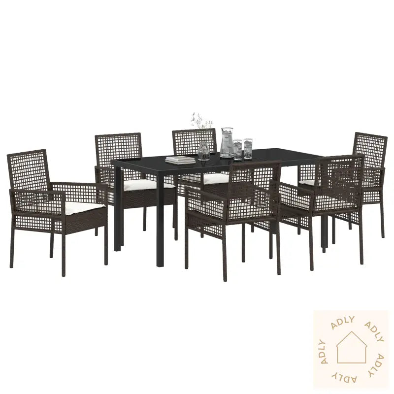 Spisebordsettet skaper et lekkert og sosialt samlingspunkt utendørs, enten det er til hverdagsbruk eller større feiringer sammen med venner og familie. Det gir deg fleksible hagemøbler du kan bruke sesong etter sesong.Stolene leveres med avtakbare puter som gir ekstra komfort når dere sitter lenge ute, og som er lette å holde rene slik at settet alltid ser innbydende ut.Med sin moderne, tidløse design og brukervennlige detaljer passer disse utendørsmøblene godt sammen med både klassiske og mer moderne stiler, og bidrar til en hyggelig atmosfære uansett anledning.Den solide stålrammen gir god stabilitet og tåler høy vekt, så du kan føle deg trygg på at både stoler og bord holder seg stabile år etter år.Smart konstruksjon gjør det enkelt å rengjøre og oppbevare møblene ved behov, noe som sikrer mest mulig glede og utnyttelse av uterommet ditt uten mye styr.Antall gjenstander: 7Farge: BrunForm: RektangulærMateriale: MetallOverflate: MattInnendørs/Utendørs: Kun utendørsTrekk inkludert: NeiBatterier inkludert: NeiHodegjerde inkludert: NeiKapasitet: 6-seterMaksimalt antall personer: 6Overflatehøyde: 3 cmBein høyde: 70 cmSitte dybde: 50 cmSittekapasitet: 6Hengestoler: NeiStige: NeiMerke:Levering inneholder: 6 x stoler, 1 x bordMontering påkrevd: JaAnbefalt antall for montering: 2