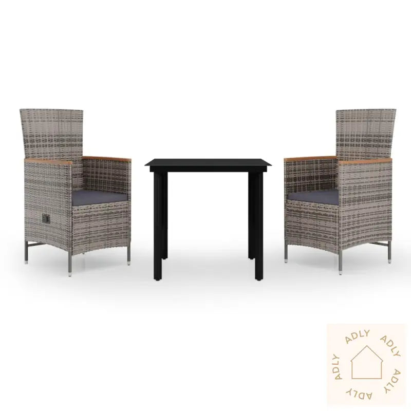 Farger: grå og svartFarge pute: mørkegråMaterialer: PE-rotting, heltre akasie, pulverlakkert stål, glassMateriale putetrekk: 100 % polyesterMål bord: 80 x 80 x 74 cm (L x B x H)Mål stol (ikke tilbakelent): 58 x 62 x 108 cm (B x D x H)Mål stol (tilbakelent): 58 x 90 x 91 cm (B x D x H)Tykkelse pute: 5 cmBredde sete: 47 cmDybde sete: 47 cmHøyde sete fra bakken uten pute: 43 cmHøyde armlene fra bakken: 67 cmMontering kreves: jaLeveransen inneholder:1 x bord2 x stoler2 x seteputer
