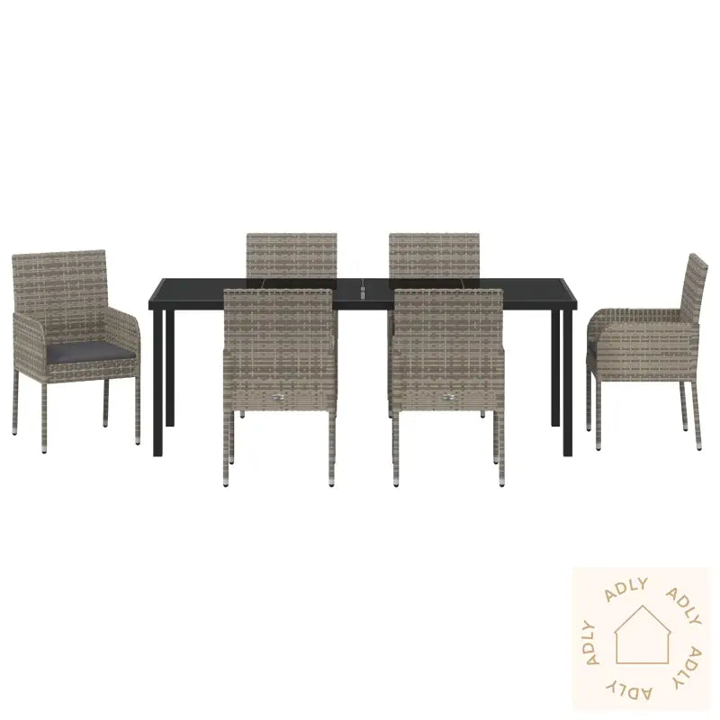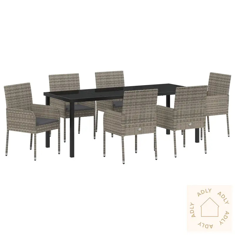 Kvalitets håndverk: Stolene er laget av robust og værbestandig PE-rotting, som holder seg like flott gjennom årstidene. Med UV-beskyttelse tåler møblene lange solfylte dager uten å falme, og de krever minimalt med vedlikehold – akkurat slik hagemøbler skal være.Robust støtte: Takket være den solide, pulverlakkerte stålrammen får du møbler som står stødig på underlaget og tåler daglig bruk over mange sesonger. Dette gir ekstra trygghet når du inviterer gjester og nyter dagene utendørs.Luksuriøs komfort: De medfølgende mørk grå putene gir premium komfort og gjør at både du og dine gjester virkelig kan slappe av. Tykk polstring sørger for myke seter, perfekte for koselige kvelder utendørs.Allsidig bruk: Enten du har balkong, terrasse, hage eller uteområde, passer dette settet sømløst inn og gir et klassisk løft til omgivelsene. Det fungerer like godt til en festlig middag som til rolige ettermiddager i frisk luft.Praktisk montering: Alle deler leveres med enkel og oversiktlig manual, så du raskt kan sette sammen hagemøblene og ta dem i bruk. To personer anbefales ved montering, og resultatet blir et stabilt og elegant sett til utendørs bruk.Antall elementer: 7Farge: GråForm: RektangulærMateriale: Syntetisk polyrottingFinish: PulverlakkertInnendørs/Ute: Kun utendørsDeksel inkludert: JaRom: Hage og terrasseBatterier inkludert: NeiHodegjerde inkludert: NeiKapasitet: 6 personerMaksimalt antall personer: 6Overflatehøyde: 3 cmBenhøyde: 43 cmSetedybde: 45 cmSittekapasitet: 6Gynger: NeiStige: NeiMerke: Levering inneholder: 6 x Hagemøbel, 1 x BordMontering kreves: JaAnbefalt antall personer for montering: 2