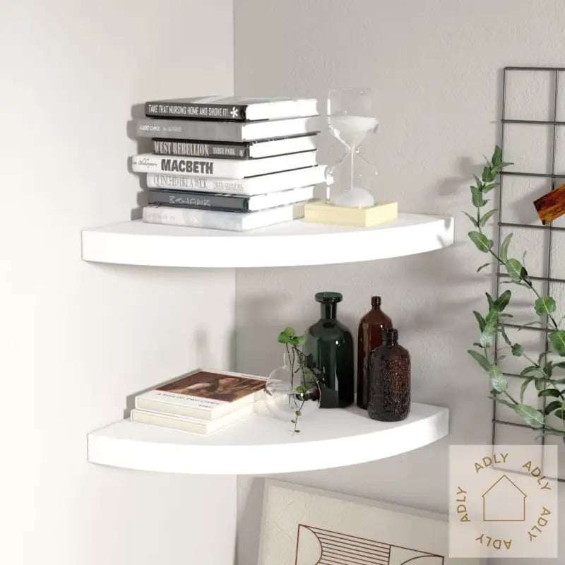 Dette settet med 2 stilige hjørnehyller gir deg en elegant og praktisk løsning for å vise frem favorittbøker, pyntegjenstander, bilder eller premier hjemme. Hyllene kan også brukes til å fremheve små plantepotter, kunst eller andre samleobjekter, enten det er på stua, kontoret eller soverommet.