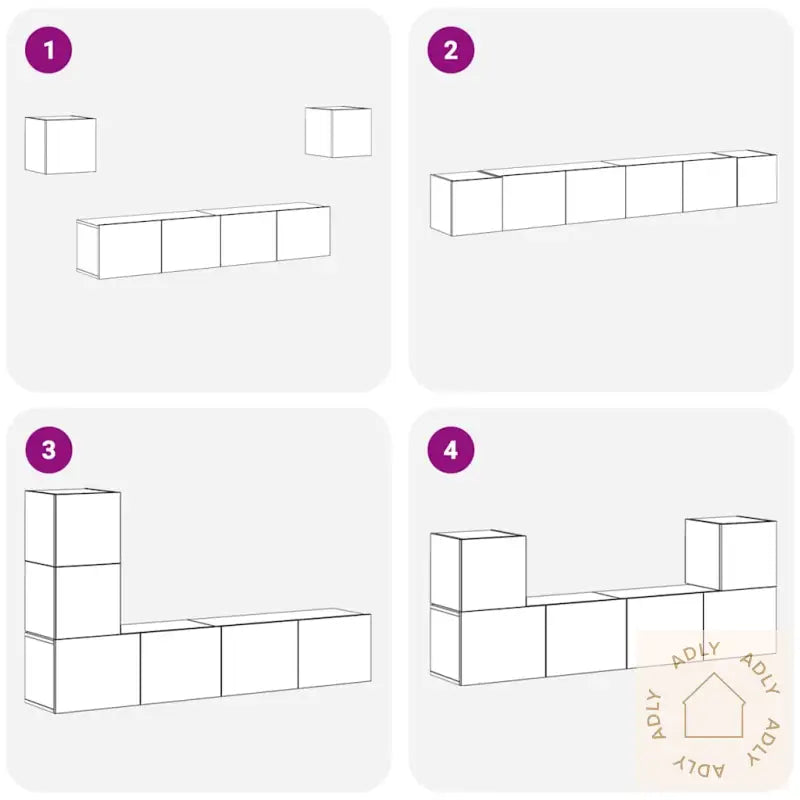 Dette moderne settet består av et hovedskap og to mindre flytende skap, så du får god plass til å organisere elektronikk, dekorelementer, bokhyller og stående hyller eller andre nødvendigheter. Med sine rektangulære former gir de rene linjene et ryddig og moderne preg til stuen. Skapene er laget av slitesterkt konstruert tre med matt finish, noe som gjør dem både robuste og lette å holde rene. Settet er kun beregnet for innendørs bruk, perfekt for deg som ønsker å skape et innbydende rom til avslapping og underholdning med praktiske møbler.