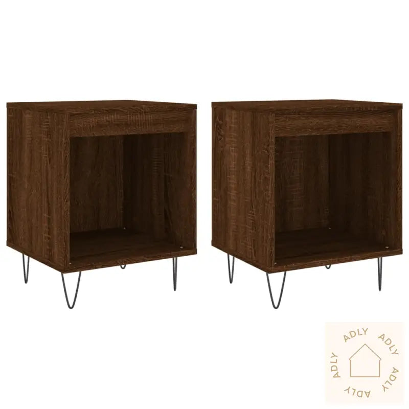 Slitesterkt materiale: Det konstruerte treverket med brun eik-finish har en glatt overflate, høy kvalitet og gjør nattbordet slitesterkt, stabilt og motstandsdyktig mot fuktighet. Dette betyr at nattbordene holder seg pene lenge, selv ved daglig bruk, og de er i tillegg svært enkle å holde rene – det holder ofte med en fuktig klut for å få dem til å skinne igjen.Rikelig lagringsplass: Med sitt åpne rom får du god plass til å organisere magasiner, bøker, fjernkontroller eller andre småting du ønsker å ha lett tilgjengelig ved sengen. Det sørger for et ryddig nattbord og bidrar til et mer harmonisk soverom.Solid topp: Den robuste toppen gir ikke bare ekstra stabilitet, men fungerer også som en flott flate for personlige elementer som dekor, bilder eller potteplanter som kan fremheve stilen på rommet.Metallben: De slanke metallbena gir nattbordet et moderne uttrykk med et hint av 70-tallsstil, samtidig som de sikrer utmerket stabilitet. Dette gjør nattbordene til både et praktisk og estetisk tilskudd i ditt hjem.Advarsel: