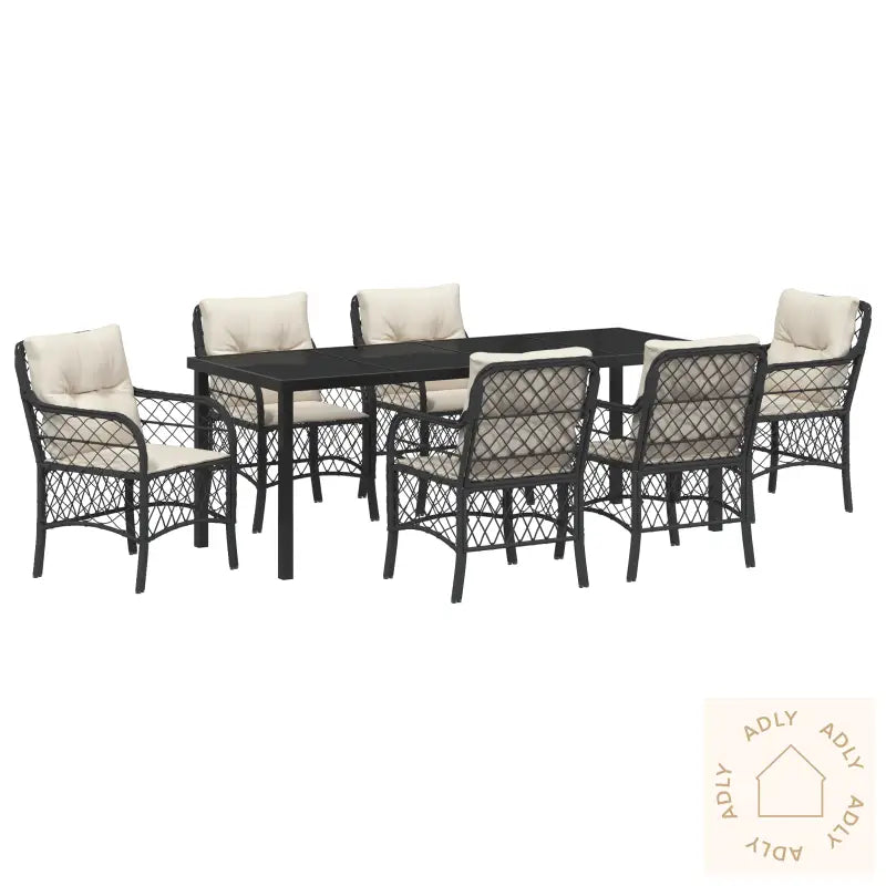 Antall deler: 7 (6 stoler og 1 bord)Farge: SvartForm: RektangulærMateriale: Syntetisk poly rattan – perfekt for slitesterke hagemøblerFinish: PulverlakkertInnendørs/Utvendørs: Kun utendørsTrekk inkludert: JaRom: Garten und TerrassegBatterier inkludert: NeiHodegavl inkludert: NeiMaksimalt antall personer: 6Maksimal vekt: 110 kg per seteOverflatehøyde (bordplate): 3 cmBenhøyde: 42 cmSete dybde: 51 cmSittekapasitet per stol: 1Gynger: NeiStige: NeiMerke: Levering inneholder: 6 x stol, 1 x bordMontering nødvendig: JaAnbefalt antall personer for montering: 2